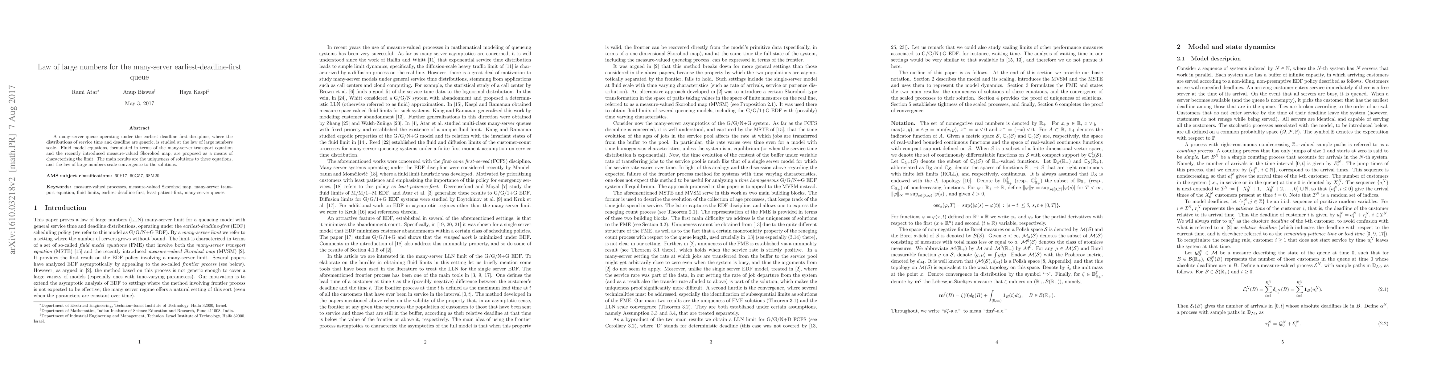 This paper studies a many-server queue with earliest deadline first discipline, proposing fluid model equations to characterize its behavior at the law of large numbers scale. The main findings include the uniqueness of solutions to these equations and their convergence to these solutions.