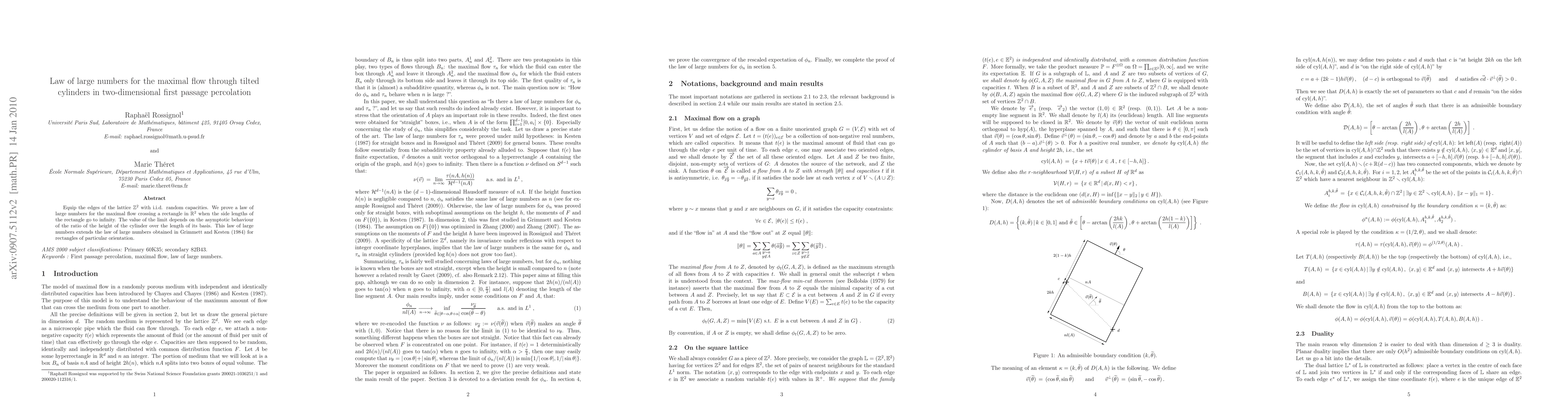 Equip the edges of the lattice $\mathbb{Z}^2$ with i.i.d. random capacities. We prove a law of large numbers for the maximal flow crossing a rectangle in $\mathbb{R}^2$ when the side lengths of the rectangle go to infinity. The value of the limit depends on the asymptotic behaviour of the ratio of the height of the cylinder over the length of its basis. This law of large numbers extends the law of large numbers obtained by Grimmett and Kesten (1984) for rectangles of particular orientation.