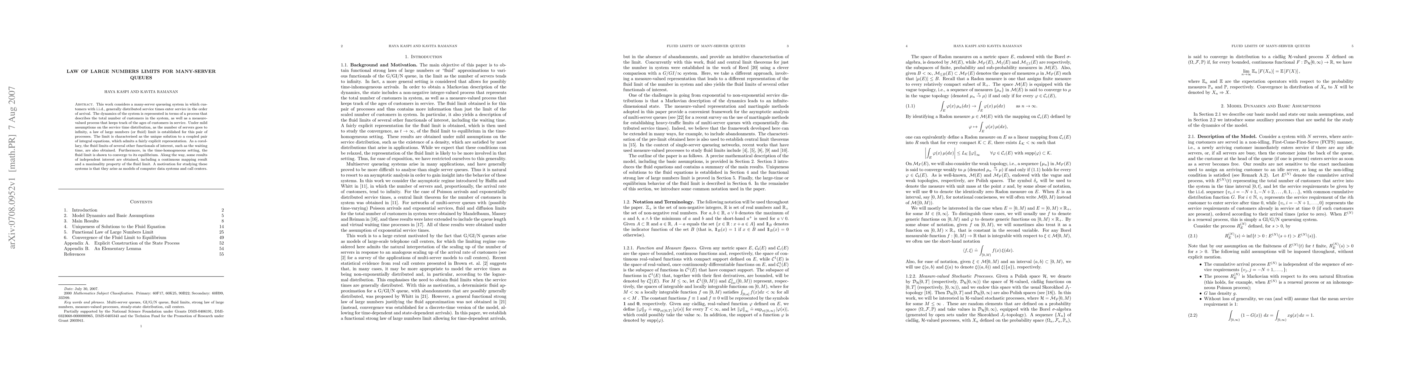 This work considers a many-server queueing system in which customers with i.i.d., generally distributed service times enter service in the order of arrival. The dynamics of the system is represented in terms of a process that describes the total number of customers in the system, as well as a measure-valued process that keeps track of the ages of customers in service. Under mild assumptions on the service time distribution, as the number of servers goes to infinity, a law of large numbers (or fluid) limit is established for this pair of processes. The limit is characterised as the unique solution to a coupled pair of integral equations, which admits a fairly explicit representation. As a corollary, the fluid limits of several other functionals of interest, such as the waiting time, are also obtained. Furthermore, in the time-homogeneous setting, the fluid limit is shown to converge to its equilibrium. Along the way, some results of independent interest are obtained, including a continuous mapping result and a maximality property of the fluid limit. A motivation for studying these systems is that they arise as models of computer data systems and call centers.