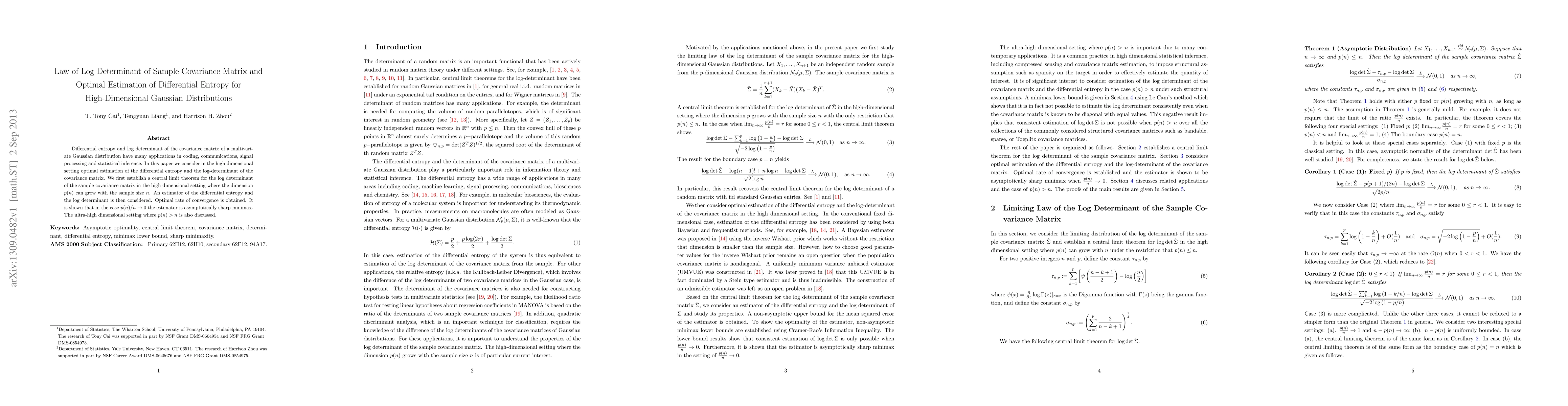This paper establishes a central limit theorem for the log determinant of the sample covariance matrix in high-dimensional settings, where the dimension can grow with the sample size. It then proposes an estimator for differential entropy and the log determinant, achieving optimal convergence rates and demonstrating asymptotic minimax optimality under certain conditions.