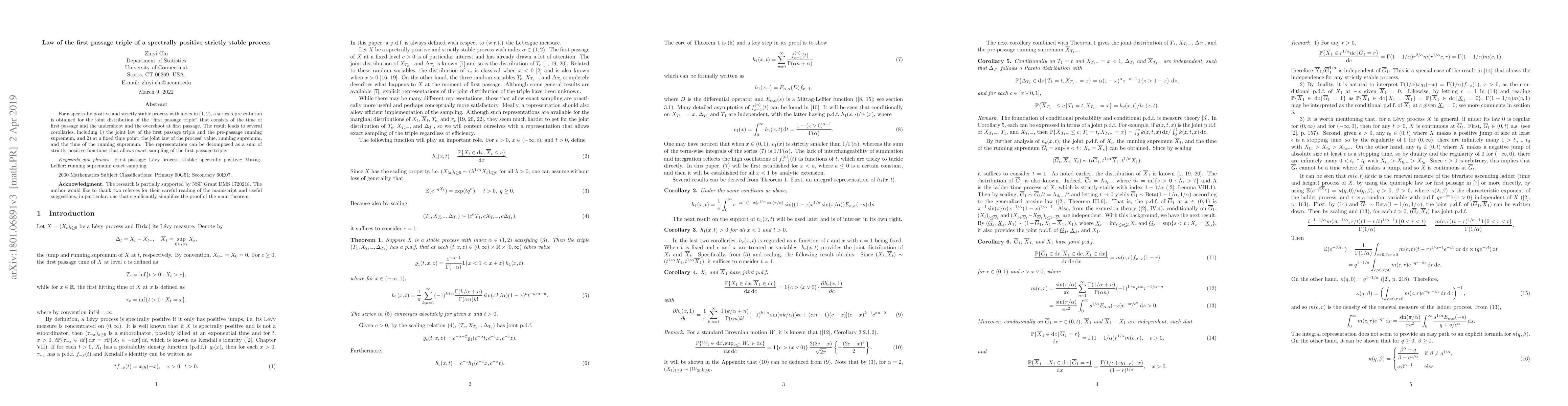 This paper derives a series representation for the joint distribution of the first passage triple of a spectrally positive strictly stable process, revealing insights into the first passage time, undershoot, and overshoot. It also provides corollaries on the joint law of the first passage triple with the pre-passage running supremum and the joint law of the process's value, running supremum, and the time of the running supremum at a fixed time point.