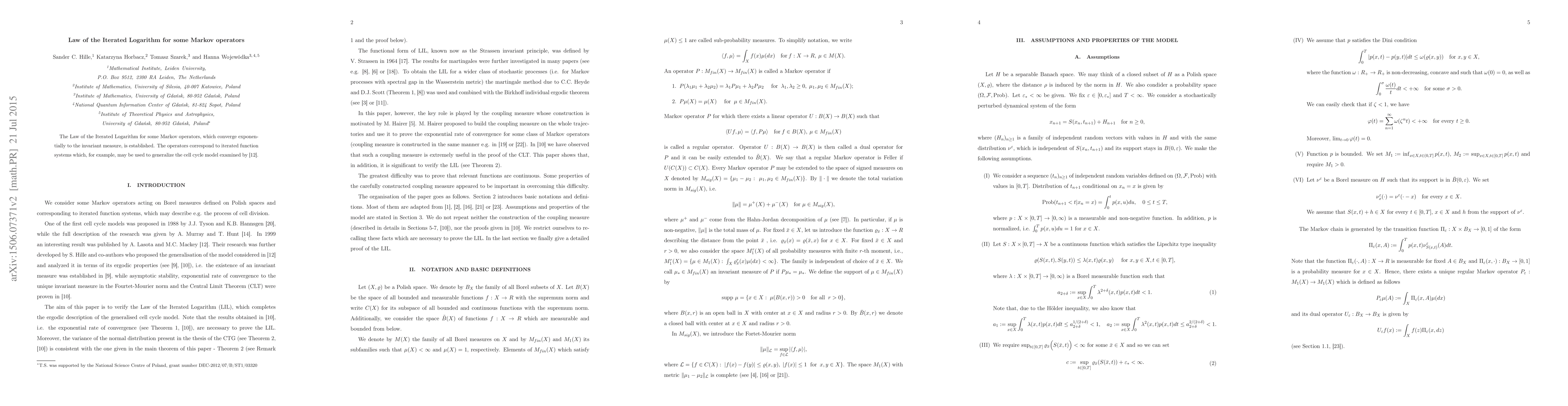 This paper establishes the Law of the Iterated Logarithm for Markov operators that converge exponentially to their invariant measure. These operators relate to iterated function systems, potentially extending models like the cell cycle model by Lasota and Mackey.