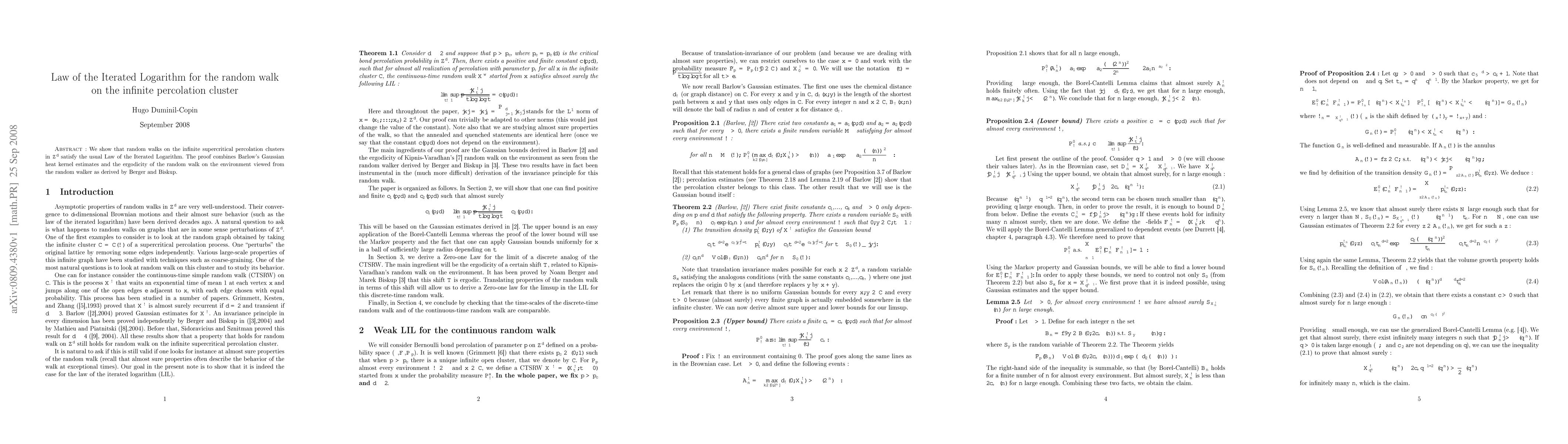 Summary: This paper demonstrates that random walks on infinite supercritical percolation clusters in Z^d adhere to the Law of the Iterated Logarithm, utilizing Barlow's Gaussian heat kernel estimates and Berger and Biskup's ergodicity results.