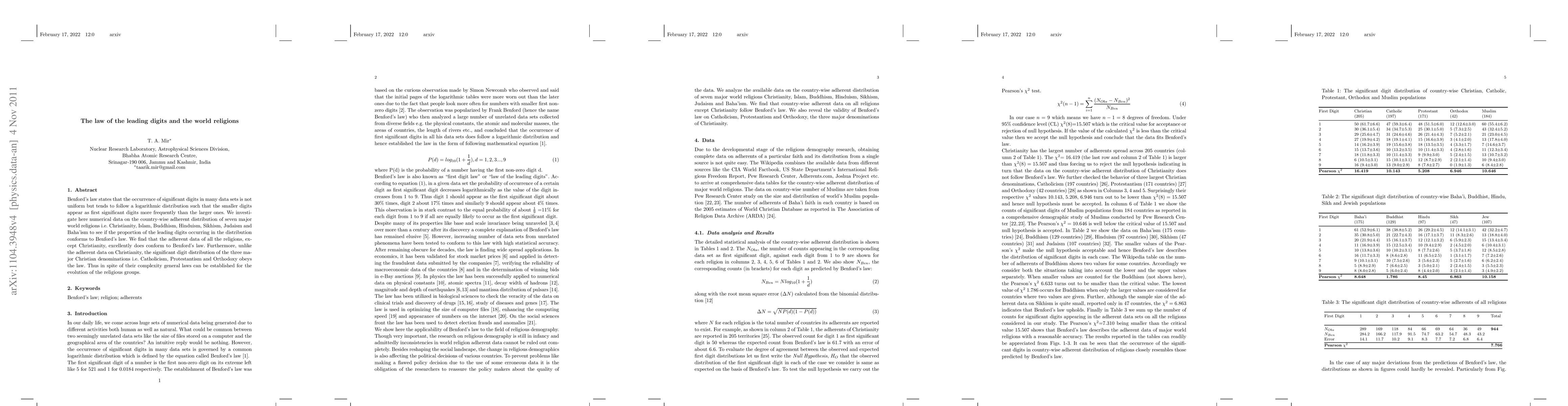 Benford's law states that the occurrence of significant digits in many data sets is not uniform but tends to follow a logarithmic distribution such that the smaller digits appear as first significant digits more frequently than the larger ones. We investigate here numerical data on the country-wise adherent distribution of seven major world religions i.e. Christianity, Islam, Buddhism, Hinduism, Sikhism, Judaism and Baha'ism to see if the proportion of the leading digits occurring in the distribution conforms to Benford's law. We find that the adherent data of all the religions, except Christianity, excellently does conform to Benford's law. Furthermore, unlike the adherent data on Christianity, the significant digit distribution of the three major Christian denominations i.e. Catholicism, Protestantism and Orthodoxy obeys the law. Thus in spite of their complexity general laws can be established for the evolution of the religious groups.