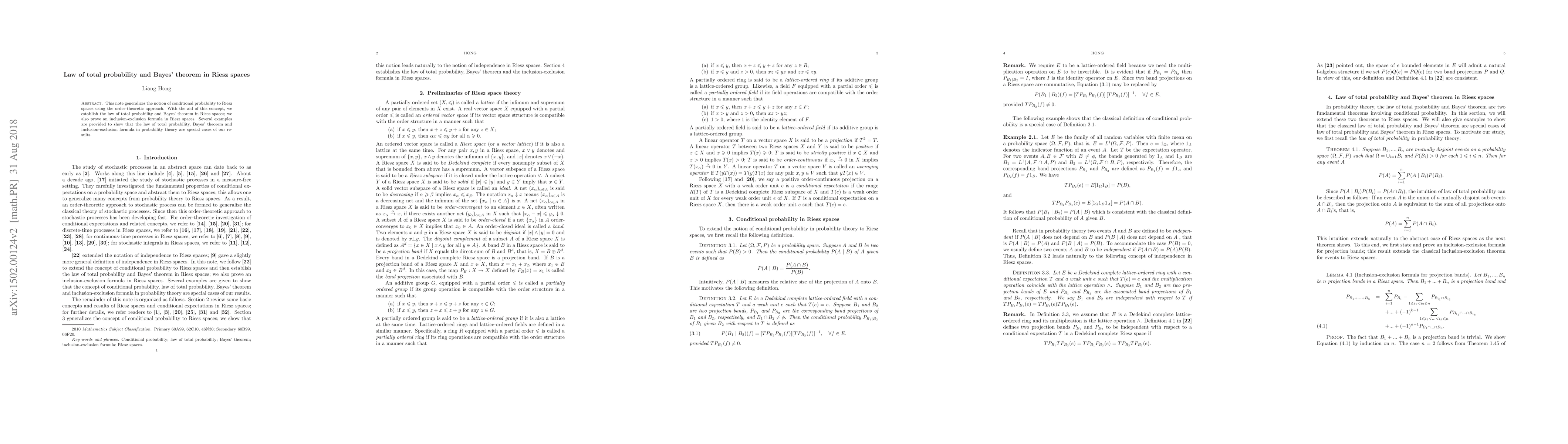 This note generalizes the notion of conditional probability to Riesz spaces using the order-theoretic approach. With the aid of this concept, we establish the law of total probability and Bayes' theorem in Riesz spaces; we also prove an inclusion-exclusion formula in Riesz spaces. Several examples are provided to show that the law of total probability, Bayes' theorem and inclusion-exclusion formula in probability theory are special cases of our results.