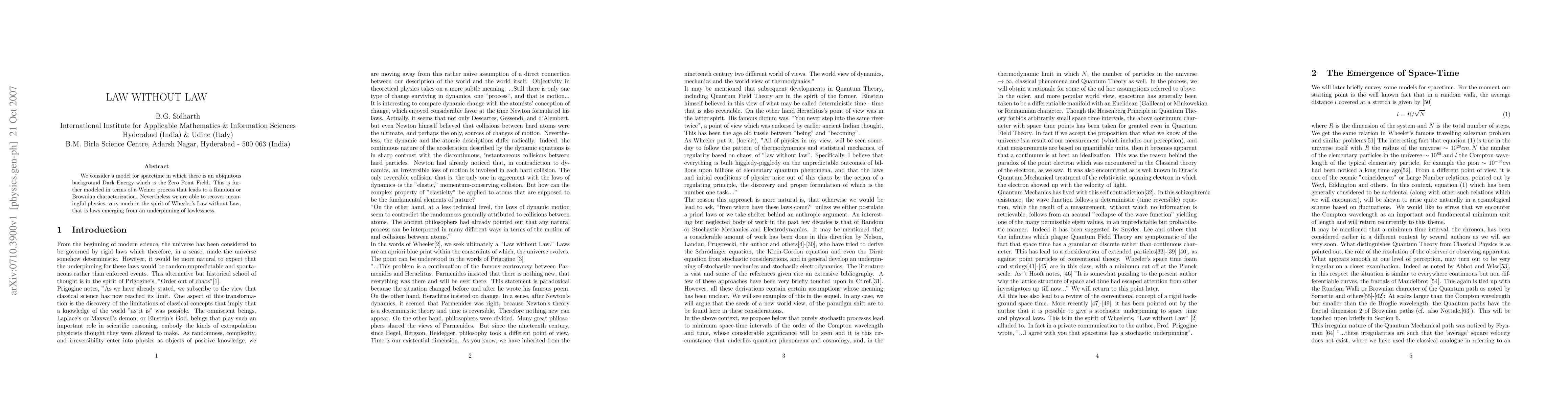We consider a model for spacetime in which there is an ubiquitous background Dark Energy which is the Zero Point Field. This is further modeled in terms of a Weiner process that leads to a Random or Brownian characterization. Nevertheless we are able to recover meaningful physics, very much in the spirit of Wheeler's Law without Law, that is laws emerging from an underpinning of lawlessness.