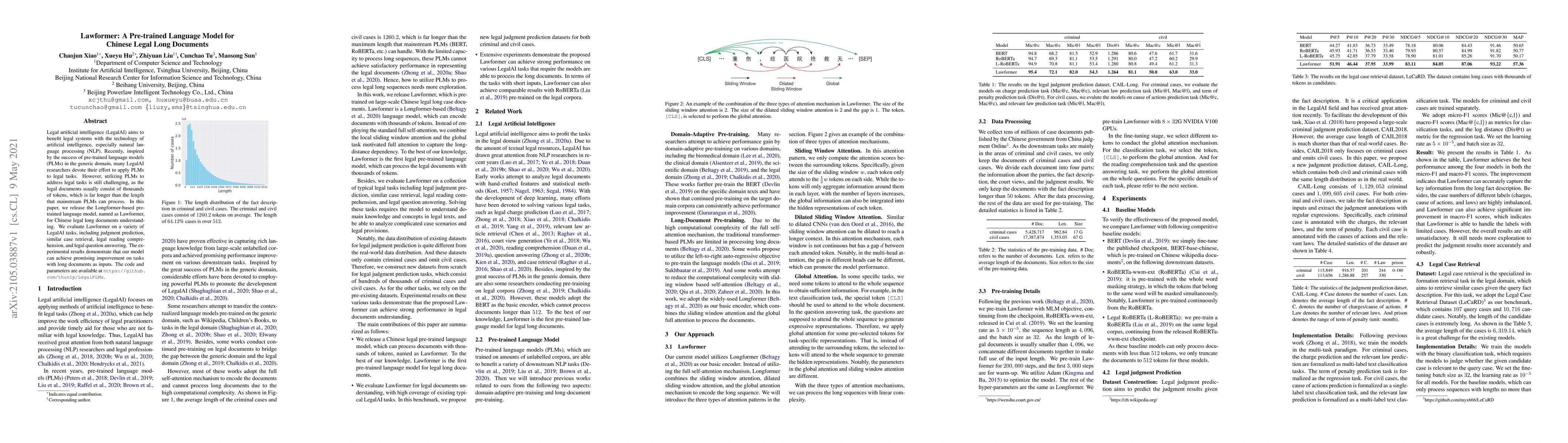 Title: Lawformer: A Pre-trained Language Model for Chinese Legal Long Documents Summary: This paper introduces Lawformer, a Longformer-based pre-trained language model tailored for understanding lengthy Chinese legal documents. It demonstrates improved performance on various LegalAI tasks involving long texts, outperforming other mainstream models.