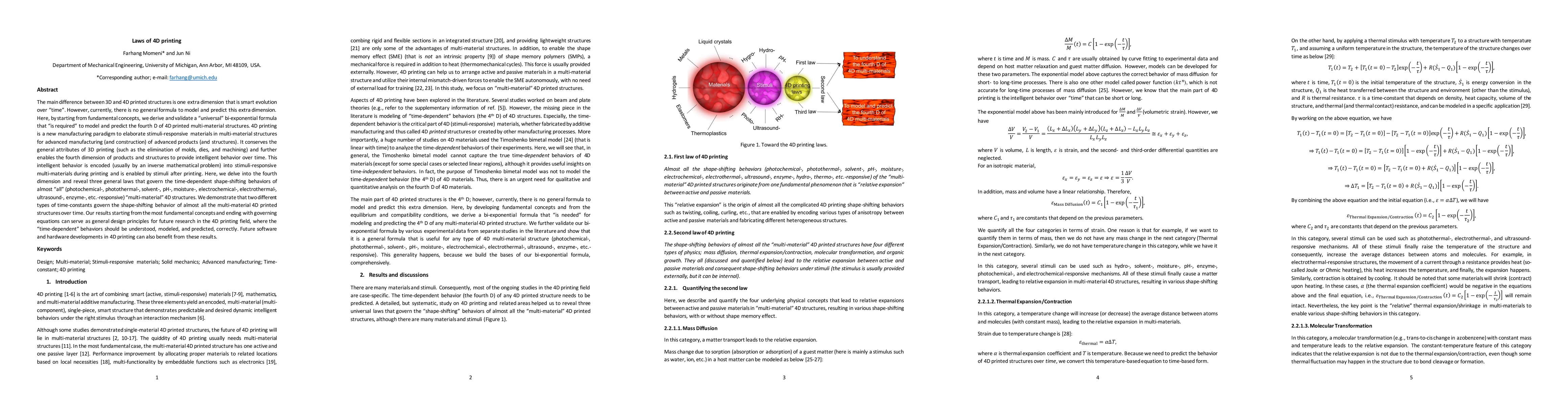 This paper derives a universal bi-exponential formula to model and predict the time-dependent shape-shifting behaviors of 4D printed multi-material structures, revealing three general laws governing their evolution over time. The findings provide fundamental design principles for future advancements in 4D printing technology.
