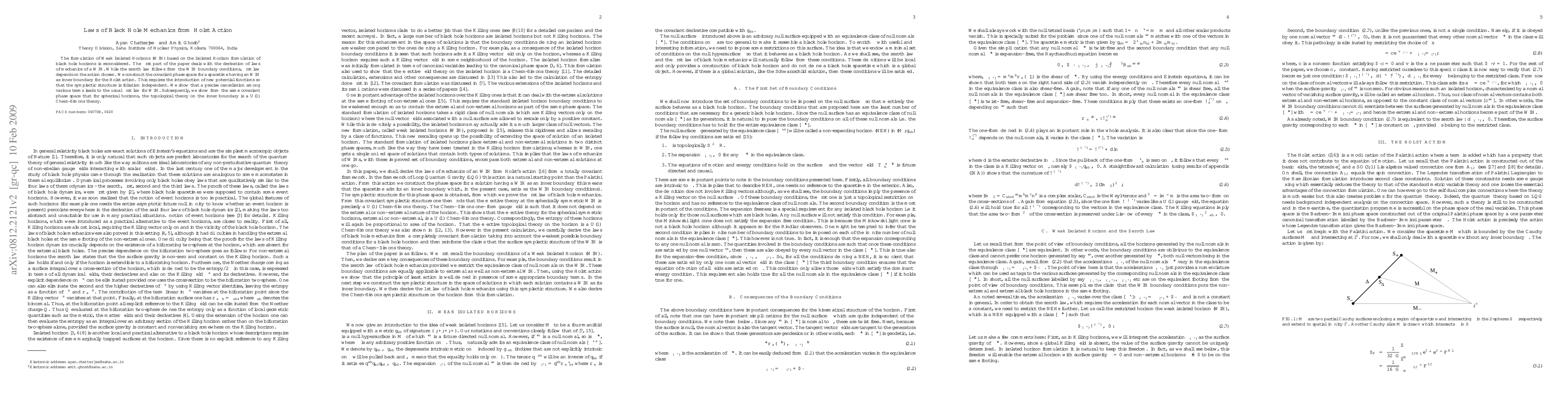 This paper derives the laws of black hole mechanics for Weak Isolated Horizons (WIH) using the Holst action. It constructs a covariant phase space for WIH, showing that the first law of mechanics emerges from a precise cancellation of terms, and identifies the topological theory on spherical horizons as a U(1) Chern-Simons theory.