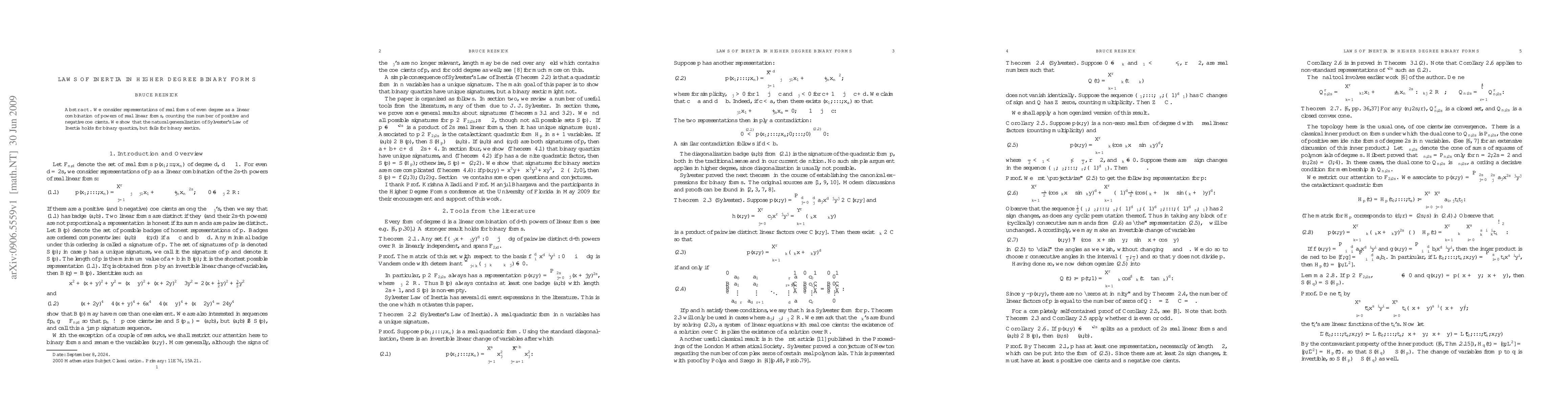 Summary: The paper explores representations of real binary forms of even degree, demonstrating that the generalized Sylvester's Law of Inertia applies to quartics but does not hold for sextics.