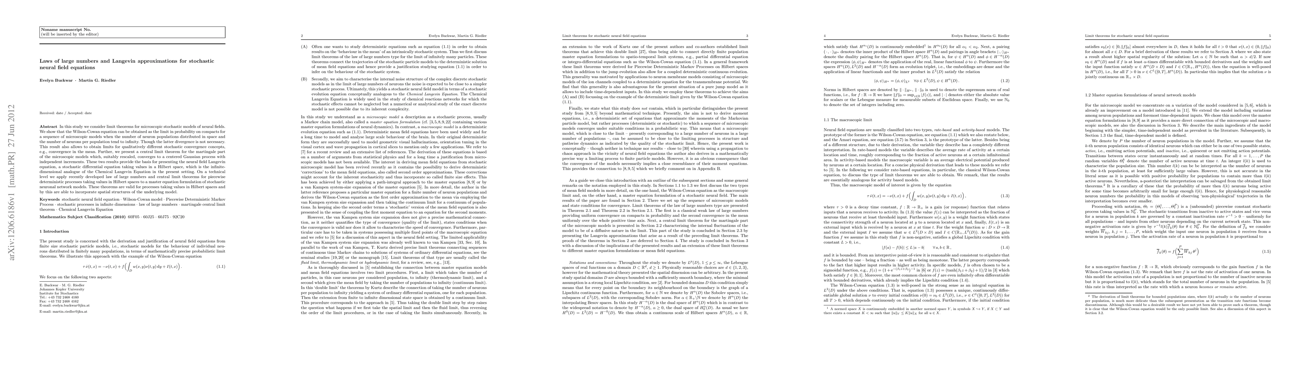 In this study we consider limit theorems for microscopic stochastic models of neural fields. We show that the Wilson-Cowan equation can be obtained as the limit in probability on compacts for a sequence of microscopic models when the number of neuron populations distributed in space and the number of neurons per population tend to infinity. Though the latter divergence is not necessary. This result also allows to obtain limits for qualitatively different stochastic convergence concepts, e.g., convergence in the mean. Further, we present a central limit theorem for the martingale part of the microscopic models which, suitably rescaled, converges to a centered Gaussian process with independent increments. These two results provide the basis for presenting the neural field Langevin equation, a stochastic differential equation taking values in a Hilbert space, which is the infinite-dimensional analogue of the Chemical Langevin Equation in the present setting. On a technical level we apply recently developed law of large numbers and central limit theorems for piecewise deterministic processes taking values in Hilbert spaces to a master equation formulation of stochastic neuronal network models. These theorems are valid for processes taking values in Hilbert spaces and by this are able to incorporate spatial structures of the underlying model.