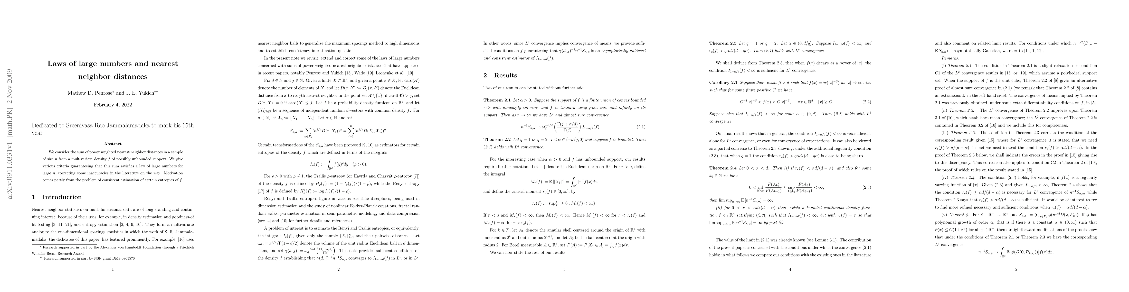 We consider the sum of power weighted nearest neighbor distances in a sample of size n from a multivariate density f of possibly unbounded support. We give various criteria guaranteeing that this sum satisfies a law of large numbers for large n, correcting some inaccuracies in the literature on the way. Motivation comes partly from the problem of consistent estimation of certain entropies of f.