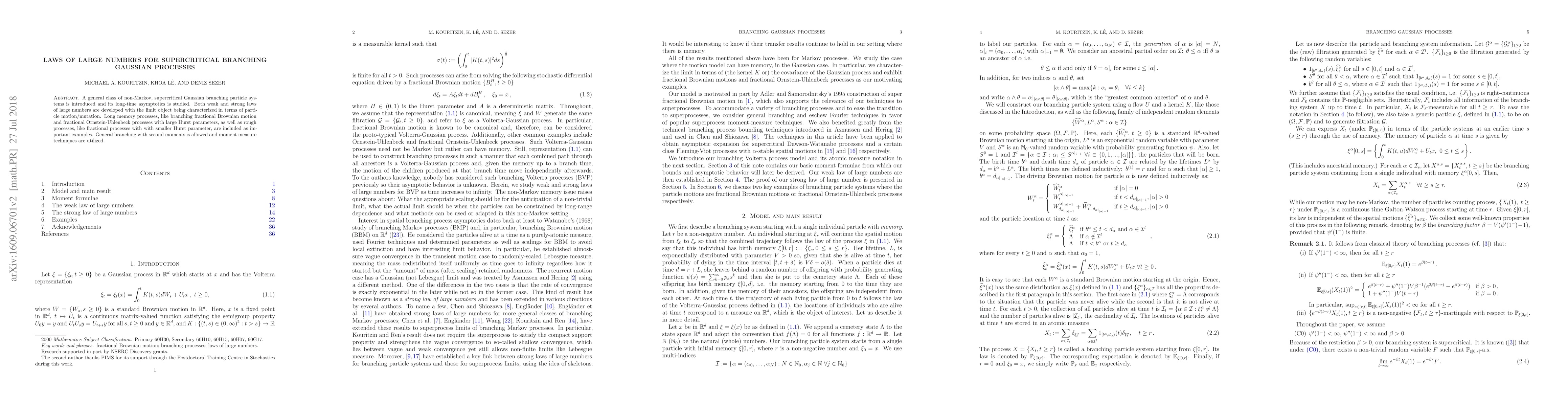 This paper introduces a class of non-Markov supercritical Gaussian branching particle systems and develops both weak and strong laws of large numbers. The study characterizes long-time asymptotics through particle motion/mutation, including examples like branching fractional Brownian motion and fractional Ornstein-Uhlenbeck processes.