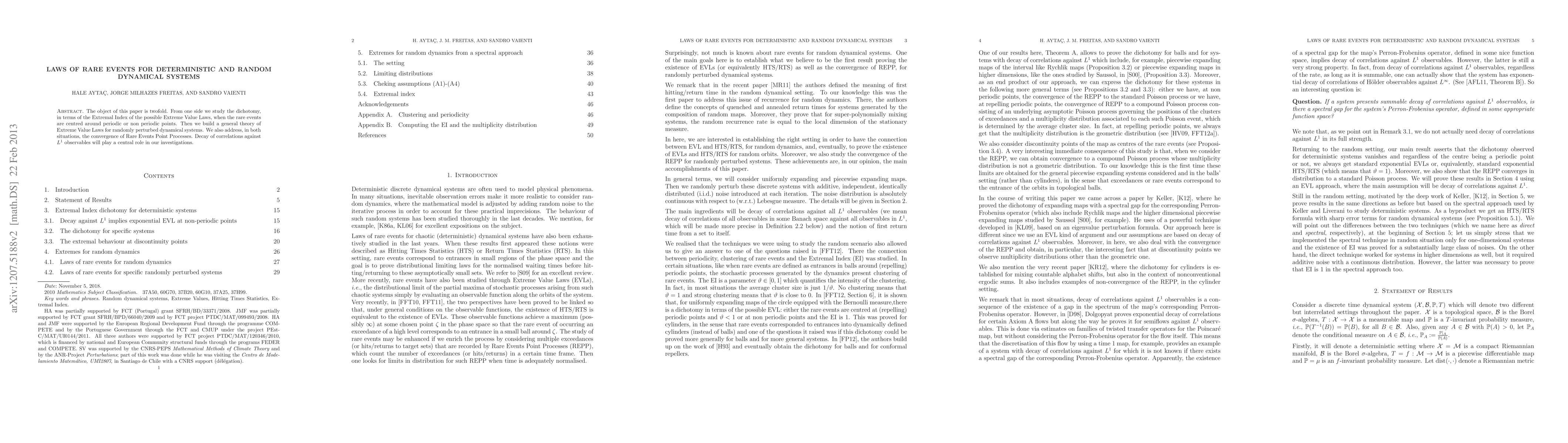 This paper explores the Extremal Index and Extreme Value Laws for both deterministic and randomly perturbed dynamical systems, focusing on rare events around periodic and non-periodic points, and investigates the convergence of Rare Events Point Processes, with decay of correlations against $L^1$ observables being a key aspect.