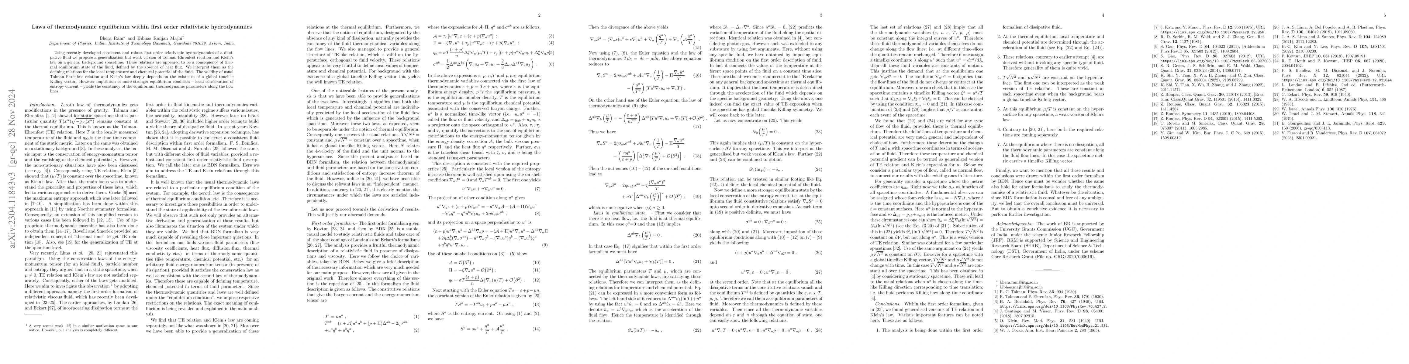 Using Israel-Stewart formalism for the description of thermodynamics of an arbitrary relativistic fluid we propose generalization of Tolman-Ehrenfest relation and Klein's law on a general background spacetime. The first relation is a consequence of thermal equilibrium only of a non-viscous fluid, while the latter one is reflection of only no-diffusion condition with or without viscosity. Interestingly, both the relations are obtained independently through the imposition of respective equilibrium conditions and also can be valid in presence of particular dissipative processes in the fluid. For a spacetime with a global timelike Killing vector, these two general relations boil down to standard forms.