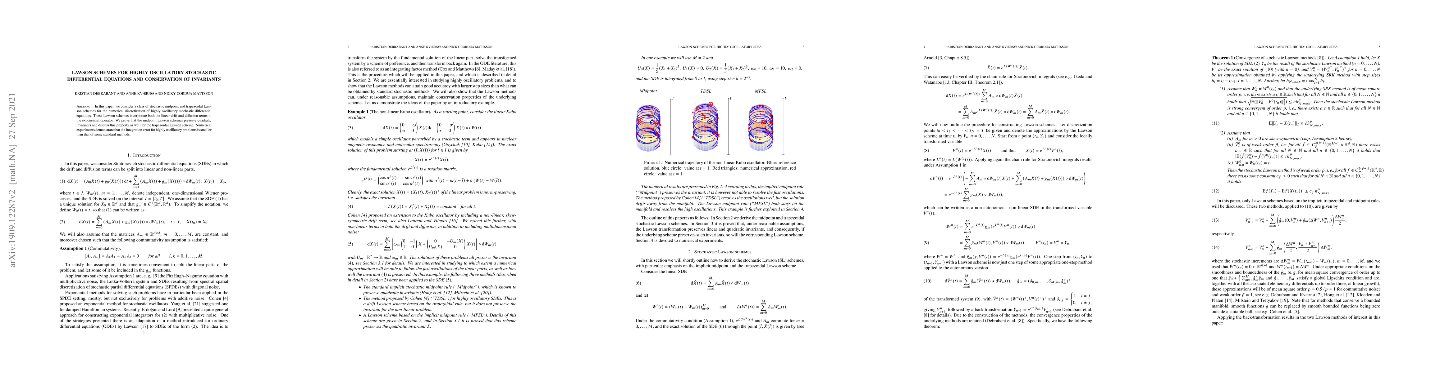 This paper introduces stochastic midpoint and trapezoidal Lawson schemes for highly oscillatory stochastic differential equations, proving that the midpoint scheme preserves quadratic invariants. Numerical experiments show these schemes outperform standard methods in reducing integration error for such problems.