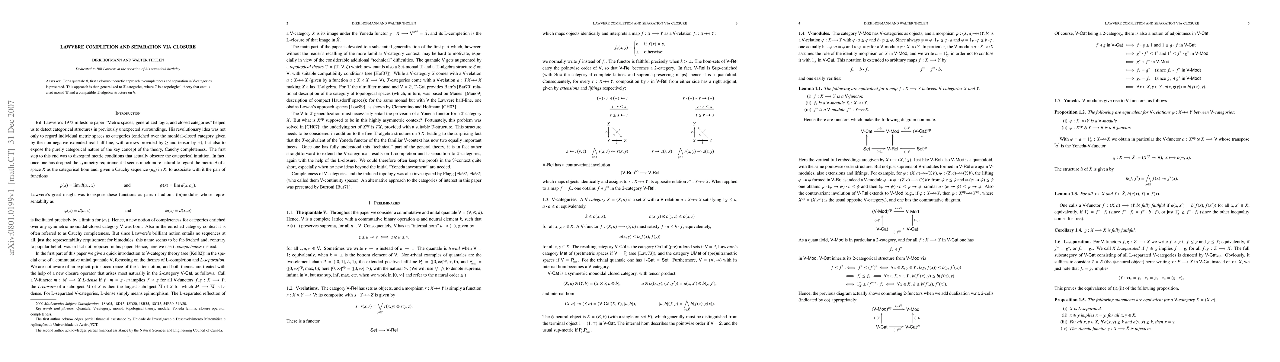 For a quantale $\V$, first a closure-theoretic approach to completeness and separation in $\V$-categories is presented. This approach is then generalized to $\Tth$-categories, where $\Tth$ is a topological theory that entails a set monad $\mT$ and a compatible $\mT$-algebra structure on $\V$.