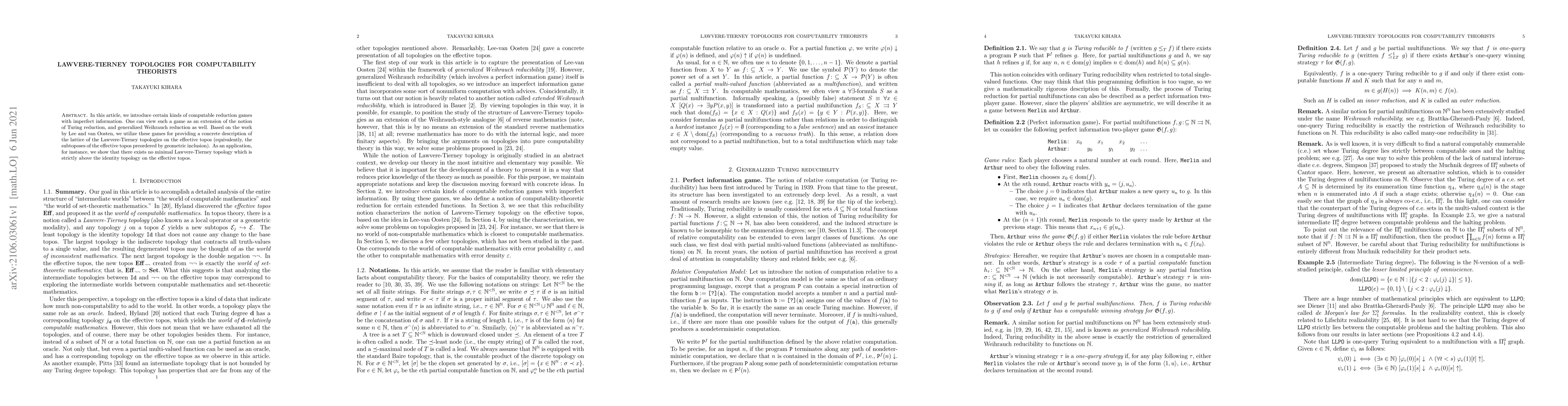 This paper introduces computable reduction games with imperfect information, extending Turing reduction and generalized Weihrauch reduction. It uses these games to describe the lattice of Lawvere-Tierney topologies on the effective topos, demonstrating that no minimal topology strictly above the identity topology exists.