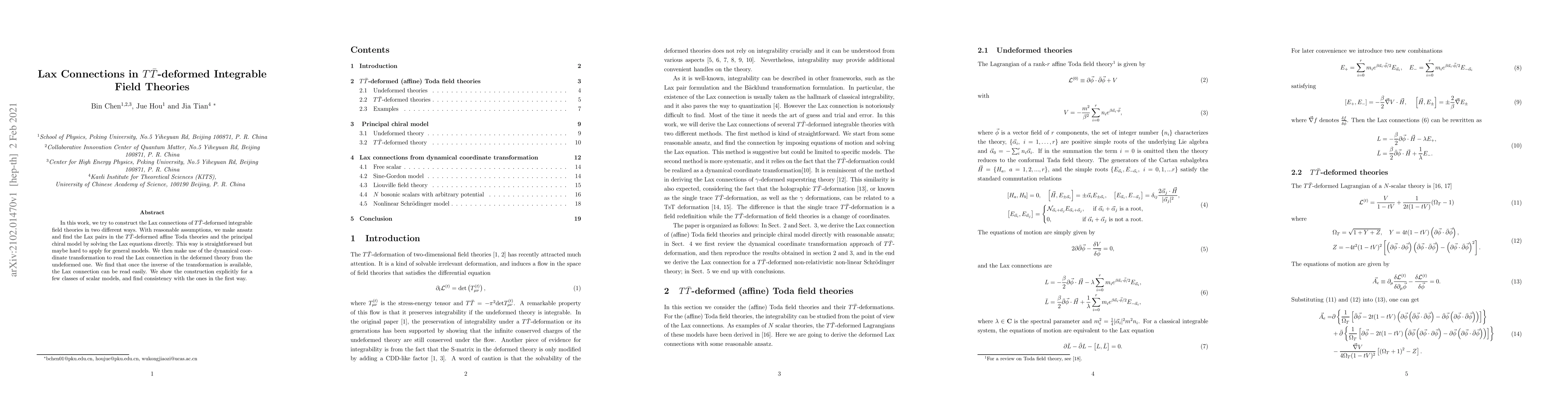 This paper constructs Lax connections for $T\bar{T}$-deformed integrable field theories using two methods: direct Lax pair solving and dynamical coordinate transformation. The first method is straightforward but may not generalize easily, while the second leverages the inverse transformation to simplify the process.
