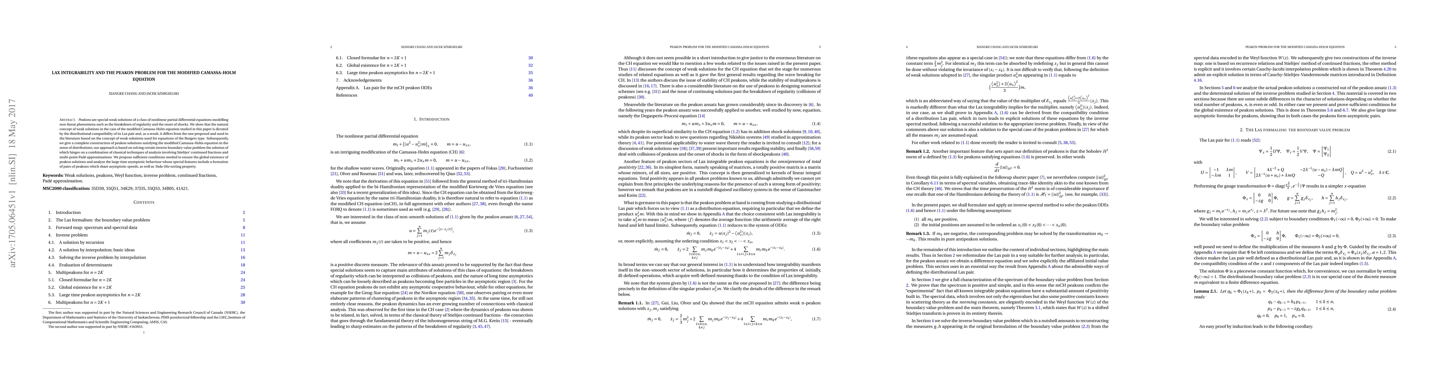 This paper demonstrates a unique approach to constructing peakon solutions for the modified Camassa-Holm equation, emphasizing the importance of Lax integrability and distributional compatibility. The authors propose conditions for global existence and analyze the asymptotic behavior, highlighting the formation of peakon pairs and a Toda-like sorting phenomenon.