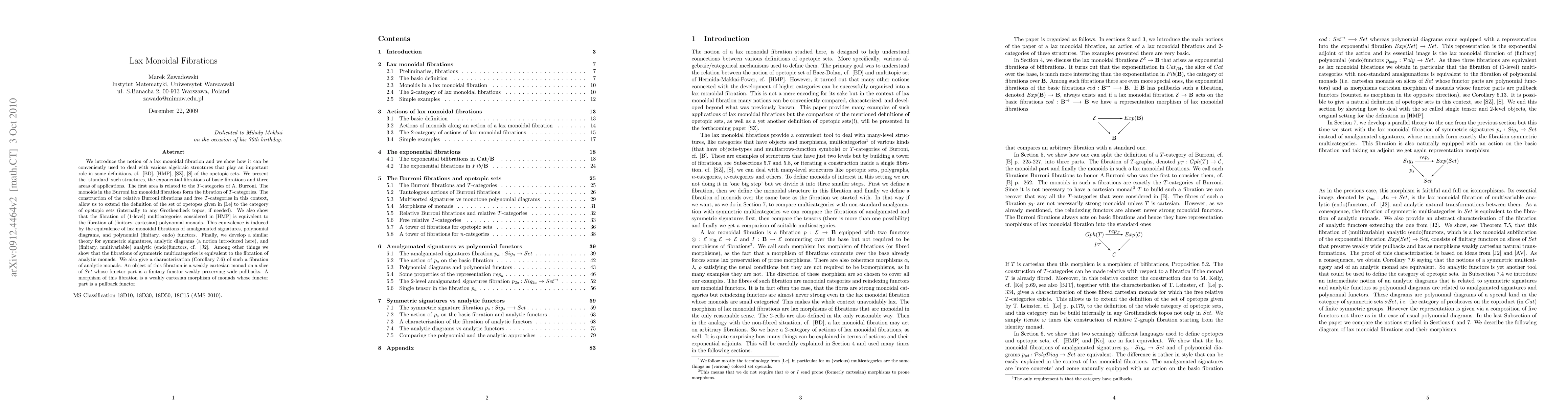We introduce the notion of a lax monoidal fibration and we show how it can be conveniently used to deal with various algebraic structures that play an important role in some definitions of the opetopic sets (Baez-Dolan, Hermida-Makkai-Power). We present the 'standard' such structures, the exponential fibrations of basic fibrations and three areas of applications. First area is related to the T-categories of A. Burroni. The monoids in the Burroni lax monoidal fibrations form the fibration of T-categories. The construction of the relative Burroni fibrations and free T-categories in this context, allow us to extend the definition of the set of opetopes given by T. Leinster to the category of opetopic sets (internally to any Grothendieck topos, if needed). We also show that fibration of (1-level) multicategories, considered by Hermida-Makkai-Power, is equivalent to the fibration of (finitary, cartesian) polynomial monads. This equivalence is induced by the equivalence of lax monoidal fibrations of amalgamated signatures, polynomial diagrams, and polynomial (finitary, endo) functors. Finally, we develop a similar theory for symmetric signatures, analytic diagrams (a notion introduced here), and (finitary, multivariable) analytic (endo)functors. Among other things we show that the fibrations of symmetric multicategories is equivalent to the fibration of analytic monads. We also give a characterization of such a fibration of analytic monads. An object of this fibration is a weakly cartesian monad on a slice of Set whose functor parts is a finitary functors weakly preserving wide pullbacks. A morphism of this fibration is a weakly cartesian morphism of monads whose functor part is a pullback functor.