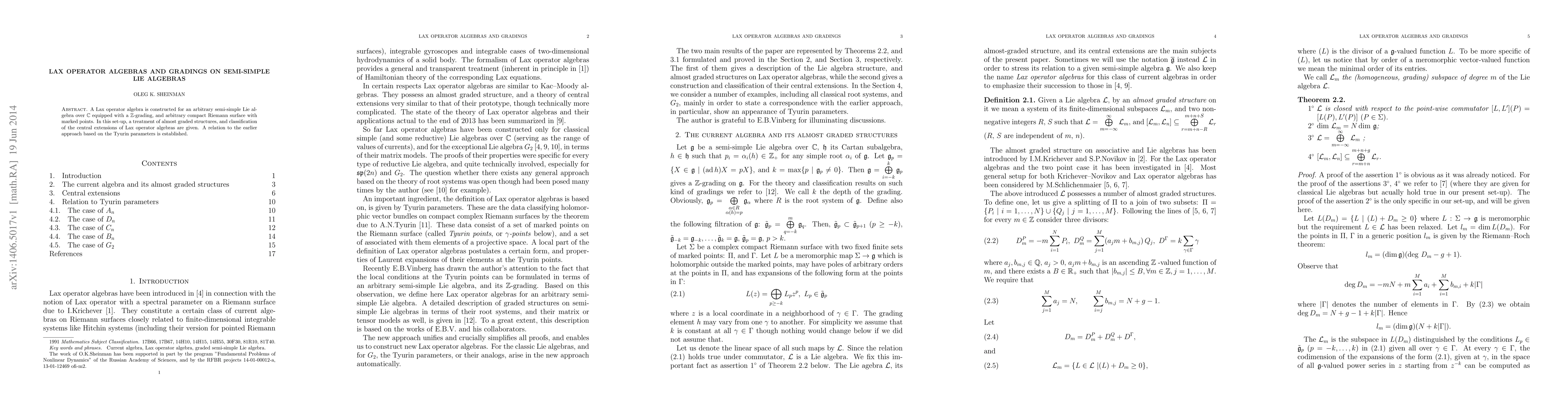 A Lax operator algebra is constructed for an arbitrary semi-simple Lie algebra over $\mathbb C$ equipped with a $\mathbb Z$-grading, and arbitrary compact Riemann surface with marked points. In this set-up, a treatment of almost graded structures, and classification of the central extensions of Lax operator algebras are given. A relation to the earlier approach based on the Tyurin parameters is established.