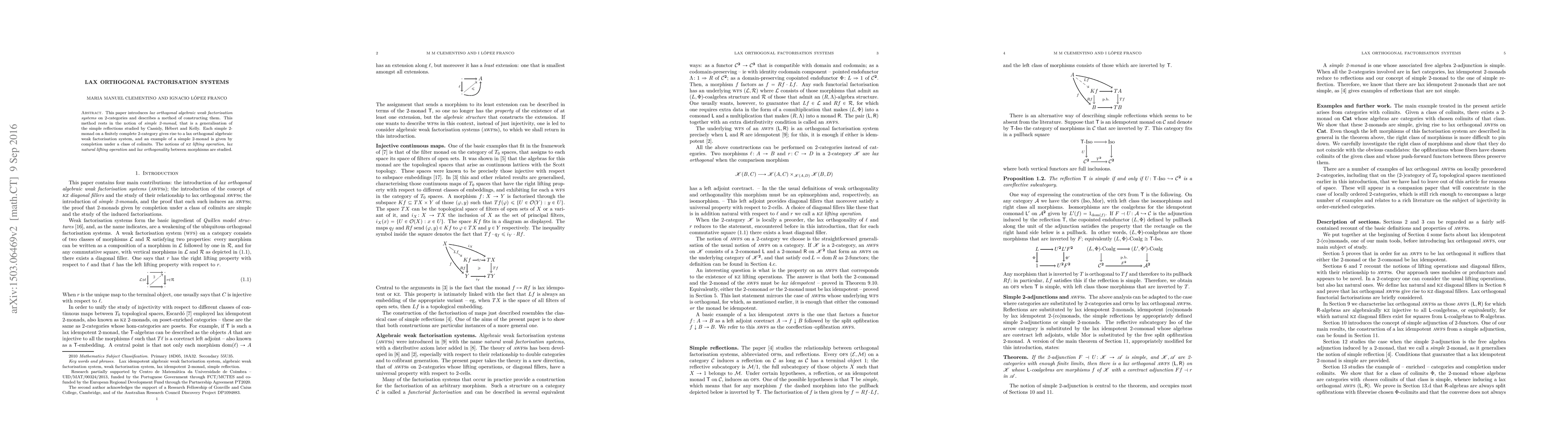 This paper introduces lax orthogonal algebraic weak factorisation systems on 2-categories and describes a method of constructing them. This method rests in the notion of simple 2-monad, that is a generalisation of the simple reflections studied by Cassidy, H\'ebert and Kelly. Each simple 2-monad on a finitely complete 2-category gives rise to a lax orthogonal algebraic weak factorisation system, and an example of a simple 2-monad is given by completion under a class of colimits. The notions of KZ lifting operation, lax natural lifting operation and lax orthogonality between morphisms are studied.