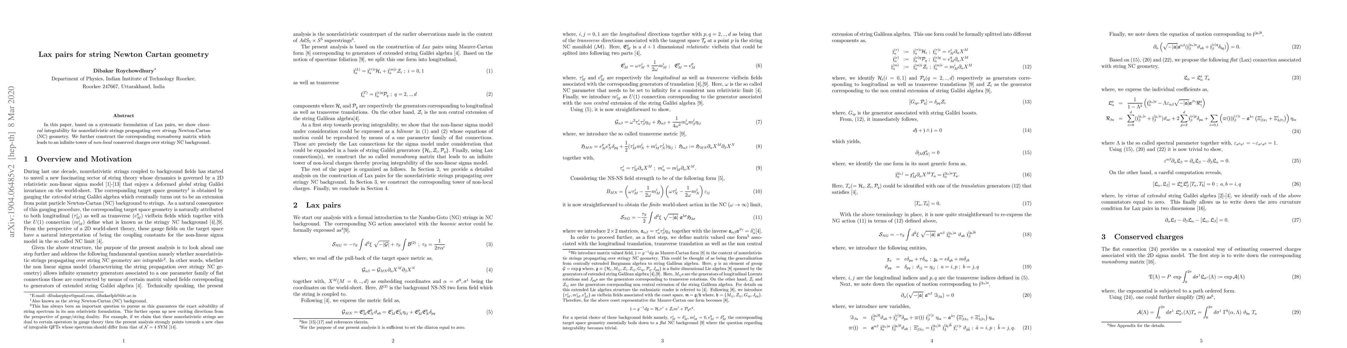 This paper demonstrates classical integrability for nonrelativistic strings in stringy Newton-Cartan geometry using Lax pairs, and constructs a monodromy matrix that results in an infinite set of non-local conserved charges.