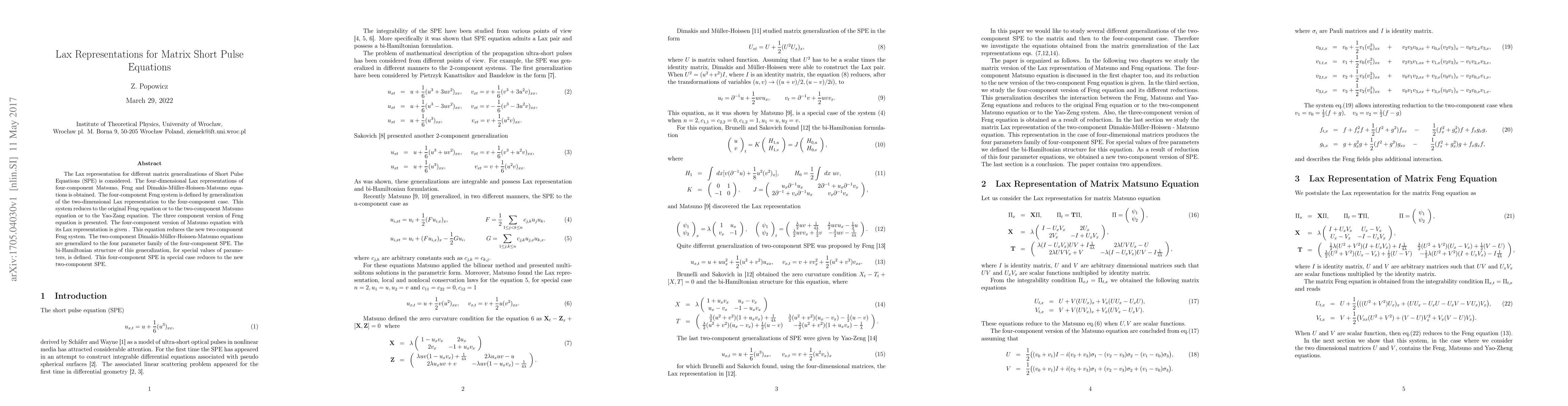 The Lax representation for different matrix generalizations of Short Pulse Equations (SPE) is considered. The four-dimensional Lax representations of four-component Matsuno, Feng and Dimakis-M\"{u}ller-Hoissen-Matsuno equations is obtained. The four-component Feng system is defined by generalization of the two-dimensional Lax representation to the four-component case. This system reduces to the original Feng equation or to the two-component Matsuno equation or to the Yao-Zang equation. The three component version of Feng equation is presented. The four-component version of Matsuno equation with its Lax representation is given . This equation reduces the new two-component Feng system. The two-component Dimakis-M\"{u}ller-Hoissen-Matsuno equations are generalized to the four parameter family of the four-component SPE. The bi-Hamiltonian structure of this generalization, for special values of parameters, is defined. This four-component SPE in special case reduces to the new two-component SPE.
