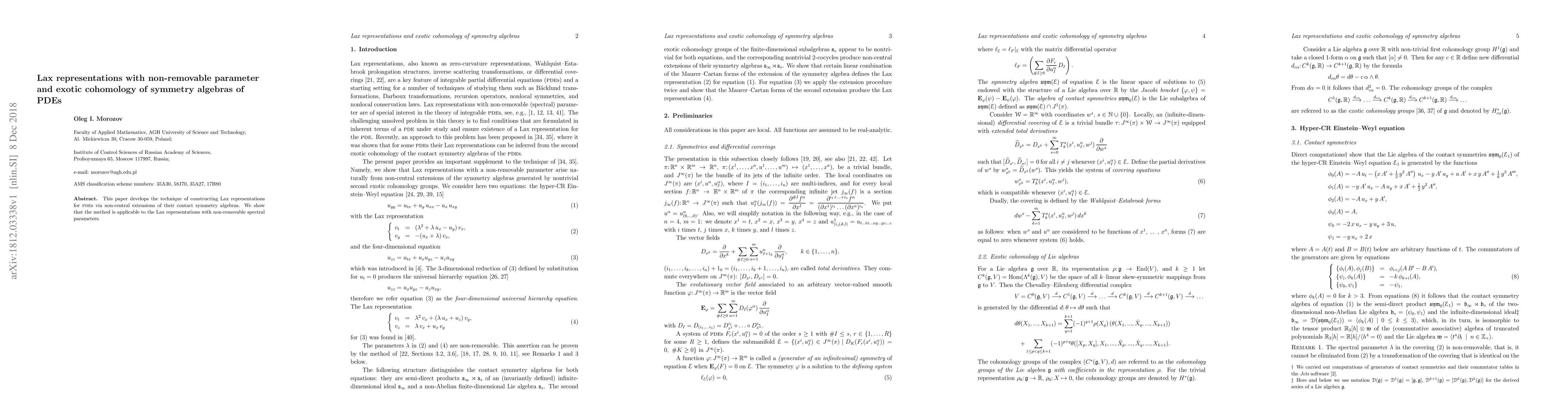 This paper introduces a method for constructing Lax representations for partial differential equations (PDEs) using non-central extensions of their contact symmetry algebras, demonstrating its applicability to representations with non-removable spectral parameters and exploring the resulting exotic cohomology.