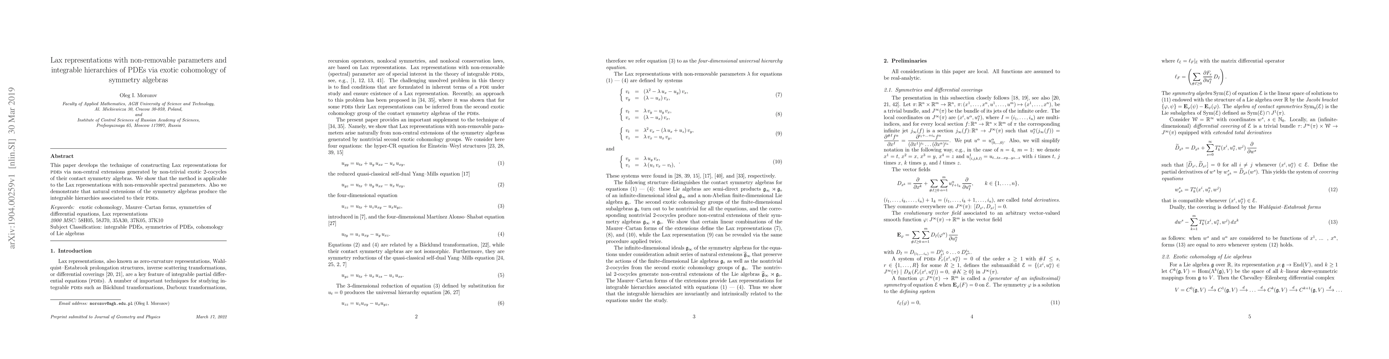This paper introduces a method for constructing Lax representations of PDEs using non-central extensions from exotic 2-cocycles in symmetry algebras, showing applicability to representations with non-removable parameters. It also reveals how these extensions generate integrable hierarchies linked to the PDEs.
