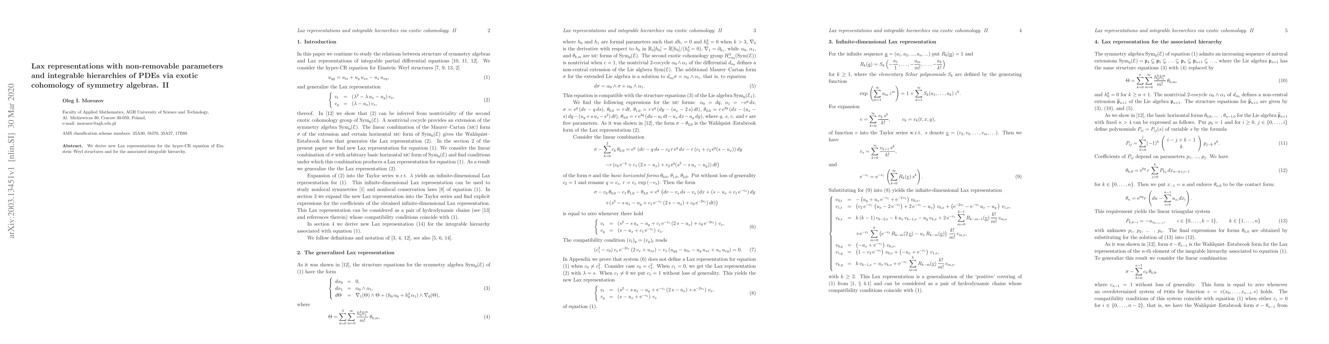 This paper introduces new Lax representations for the hyper-CR equation of Einstein-Weyl structures, extending the framework to an associated integrable hierarchy. The approach leverages exotic cohomology of symmetry algebras to achieve these derivations.