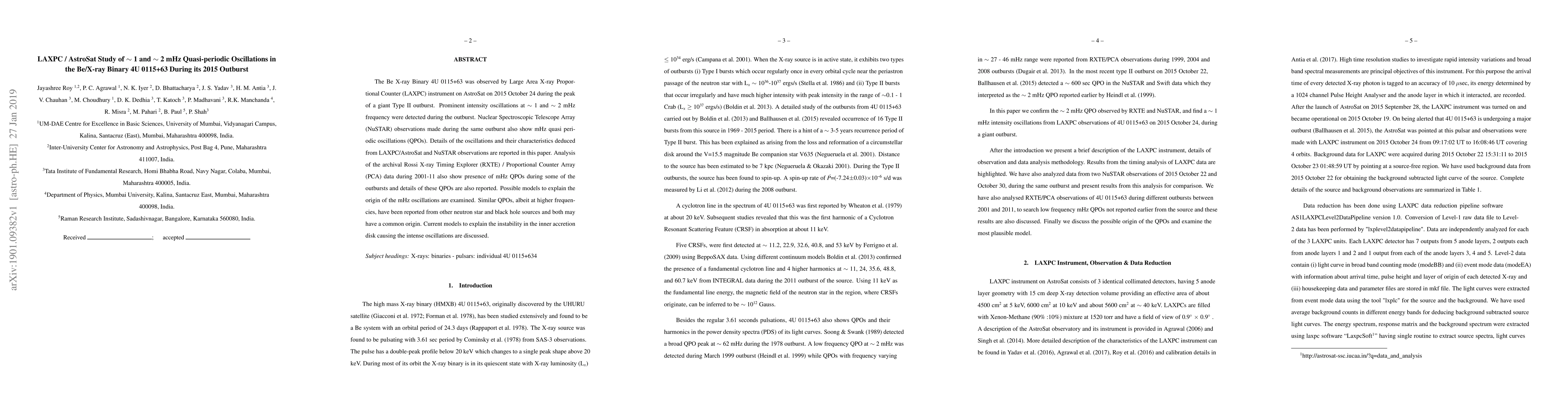 Researchers detected quasi-periodic oscillations at ~1 and ~2 mHz in the Be/X-ray Binary 4U 0115+63 during its 2015 outburst, using LAXPC/AstroSat and NuSTAR observations.