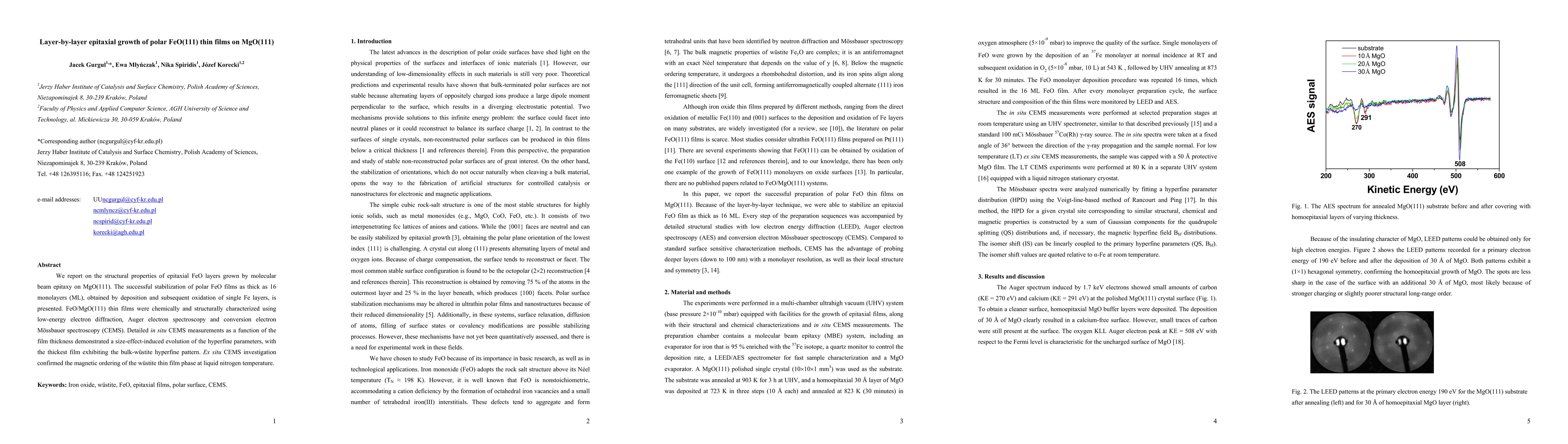 This study reports the successful epitaxial growth of 16 monolayer thick polar FeO(111) films on MgO(111) substrates via molecular beam epitaxy, characterized by structural and magnetic techniques revealing size-induced changes in hyperfine parameters and magnetic ordering at low temperatures.
