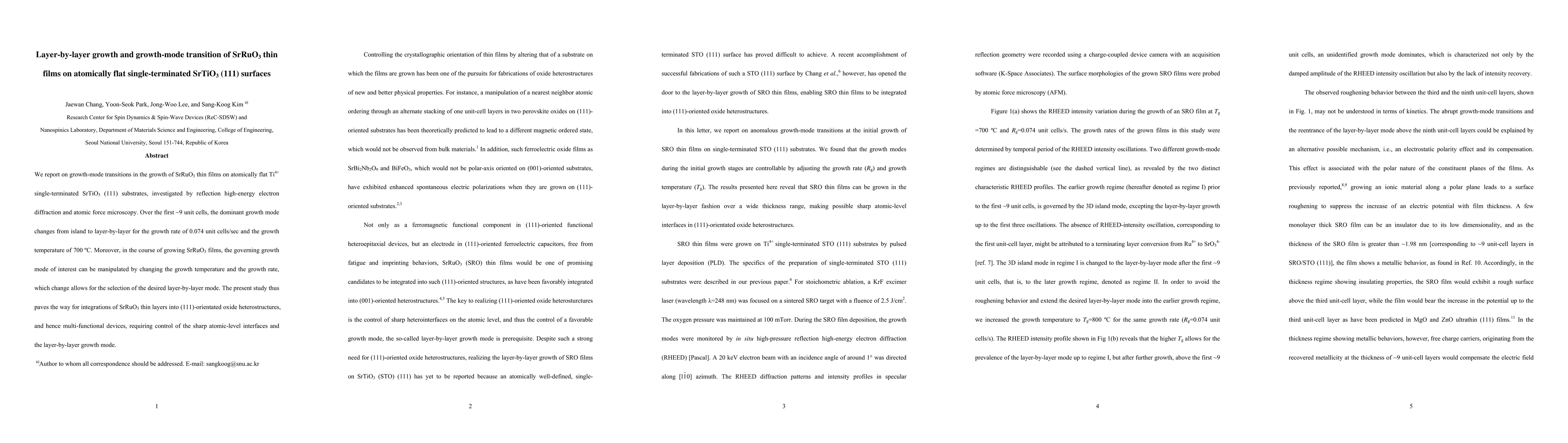 This paper investigates the transition in growth modes for SrRuO3 thin films on SrTiO3 (111) substrates, showing that layer-by-layer growth becomes dominant over initial islands after ~9 unit cells at 700°C and 0.074 unit cells/sec. The study demonstrates that growth mode can be controlled by adjusting temperature and rate, facilitating the integration of controlled SrRuO3 layers into functional oxide heterostructures.