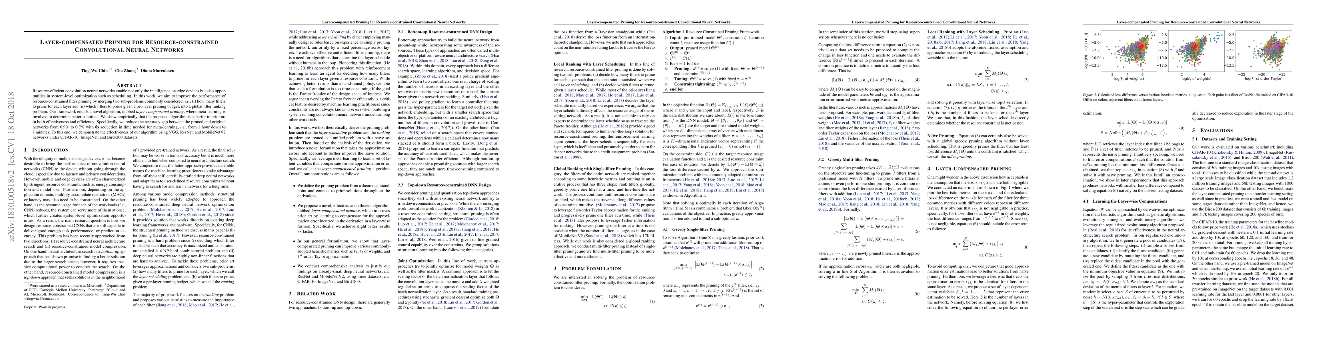 This paper proposes a novel layer-compensated pruning algorithm for resource-constrained convolutional neural networks, integrating filter pruning into a global ranking problem using meta-learning. The method achieves a 0.9% reduction in accuracy gap compared to prior methods, with a significant 8x decrease in meta-learning time.