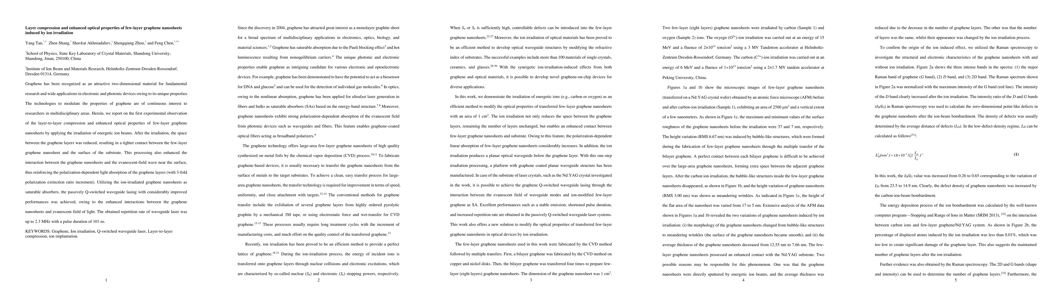 This study reports on the compression of few-layer graphene nanosheets and enhanced optical properties via ion irradiation, leading to tighter layer contact and improved light absorption. The processed graphene demonstrated superior performance in waveguide laser applications, achieving a repetition rate of 2.3 MHz and a pulse duration of 101 ns.