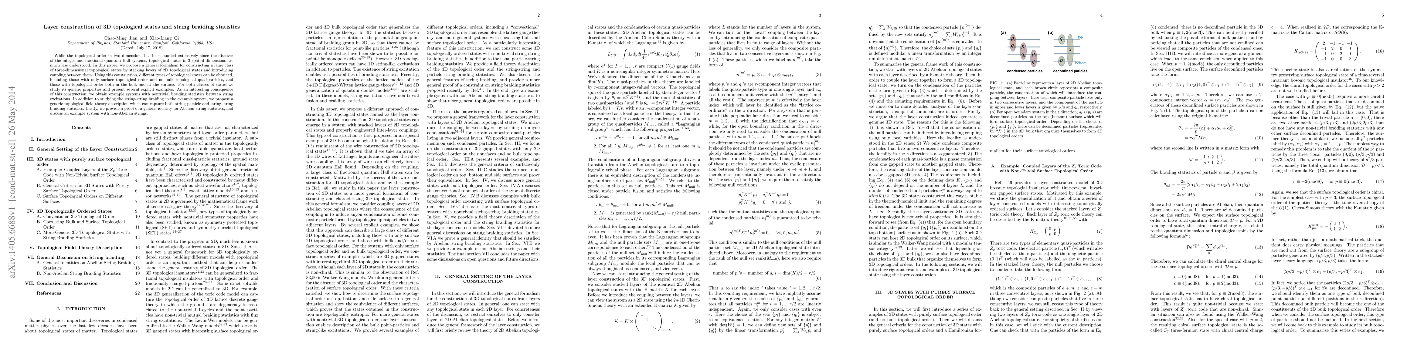 This paper proposes a formalism for constructing a wide range of 3D topological states by stacking layers of 2D topological states and coupling them. It explores both surface-only and bulk-surface topological orders, and introduces nontrivial braiding statistics between string excitations.