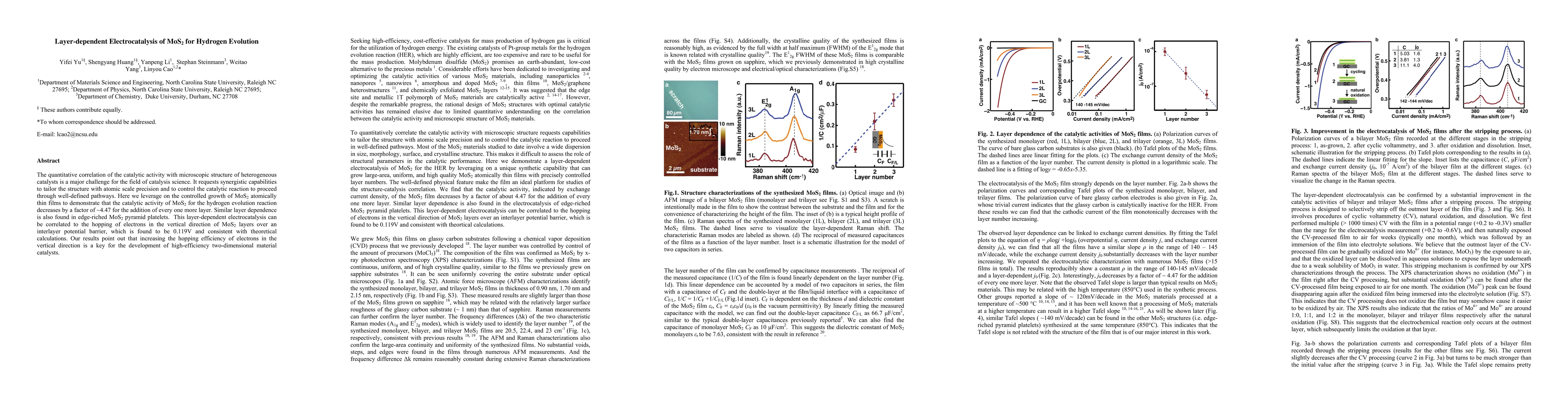 MoS2 catalysts show decreased hydrogen evolution activity with each additional layer, likely due to increased electron hopping barriers. This finding highlights the importance of optimizing two-dimensional material catalysts for improved efficiency.