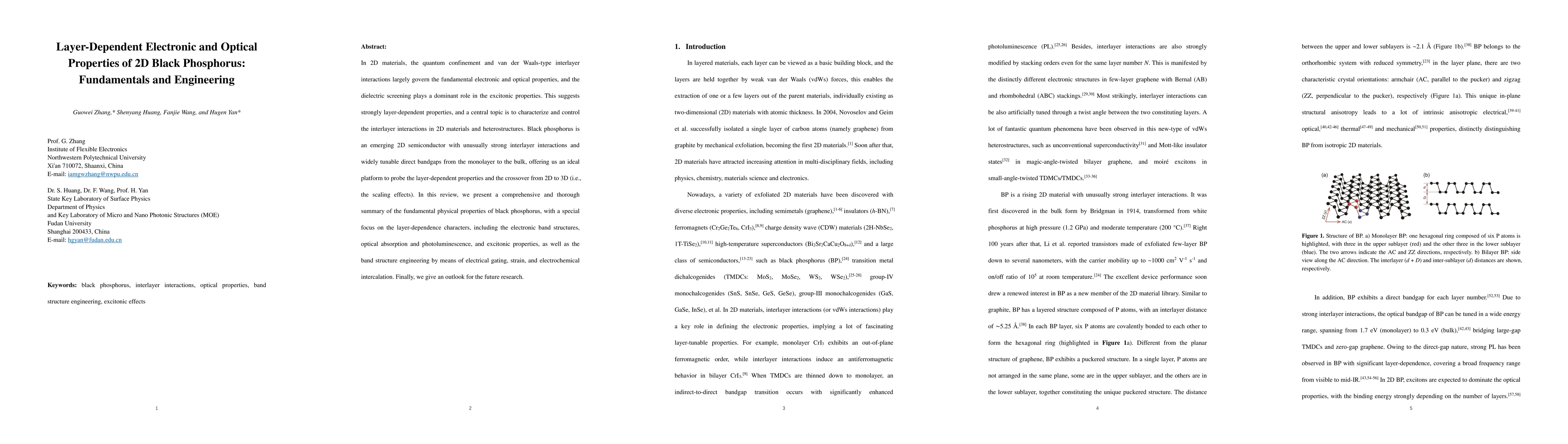 This paper reviews the layer-dependent electronic and optical properties of 2D black phosphorus, emphasizing its tunable bandgaps and excitonic behaviors, and explores methods for band structure engineering through gating, strain, and intercalation. Future research directions are also outlined.