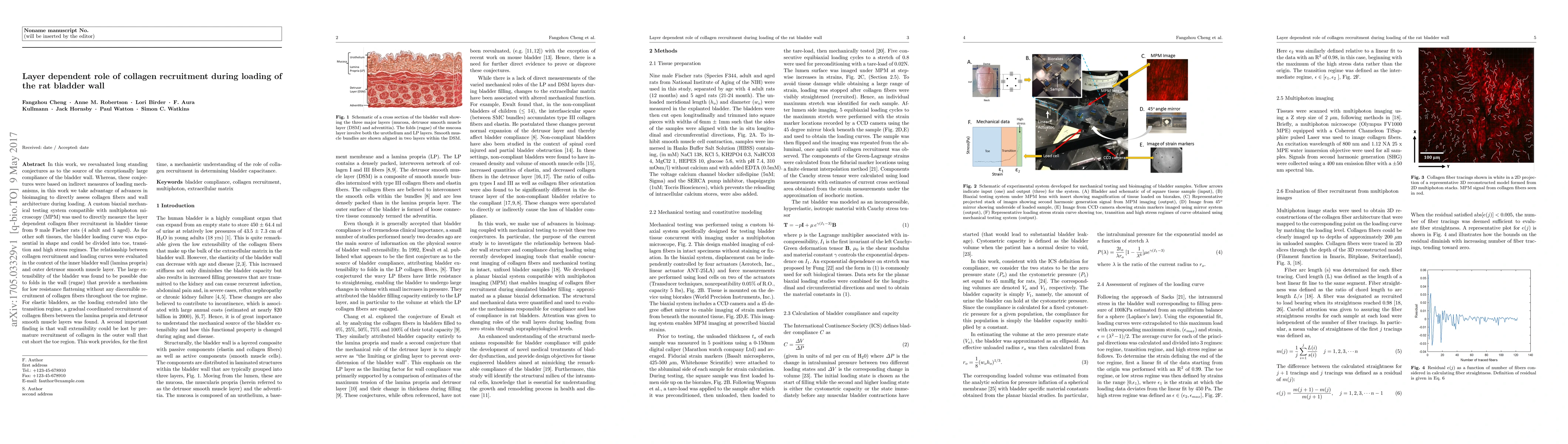 This study uses advanced bioimaging and biaxial mechanical testing to directly assess collagen fiber recruitment in rat bladder wall layers during loading, revealing that bladder extensibility is maintained by folds in the wall without collagen recruitment until the transition regime. Premature collagen recruitment in the outer layer can reduce bladder capacitance.