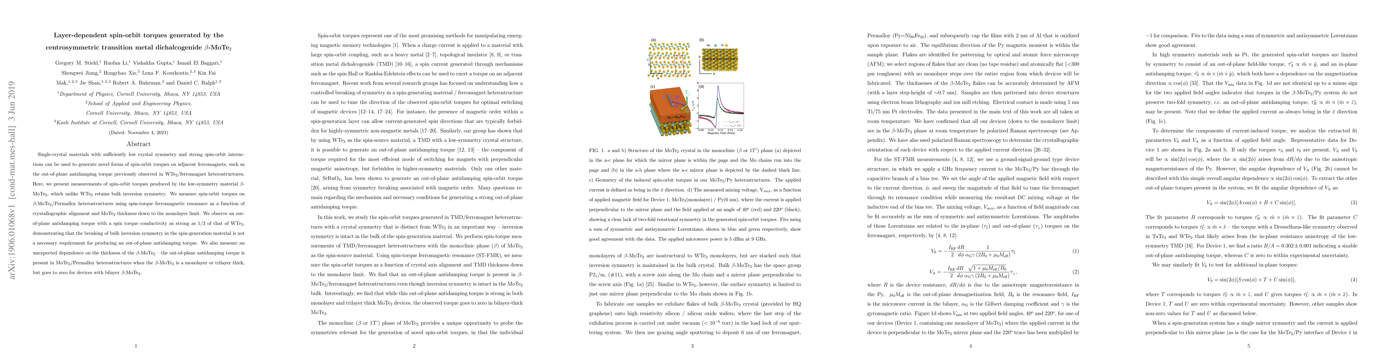 Single-crystal materials with sufficiently low crystal symmetry and strong spin-orbit interactions can be used to generate novel forms of spin-orbit torques on adjacent ferromagnets, such as the out-of-plane antidamping torque previously observed in WTe$_2$/ferromagnet heterostructures. Here, we present measurements of spin-orbit torques produced by the low-symmetry material $\beta$-MoTe$_2$, which unlike WTe$_2$ retains bulk inversion symmetry. We measure spin-orbit torques on $\beta$-MoTe$_2$/Permalloy heterostructures using spin-torque ferromagnetic resonance as a function of crystallographic alignment and MoTe$_2$ thickness down to the monolayer limit. We observe an out-of-plane antidamping torque with a spin torque conductivity as strong as 1/3 of that of WTe$_2$, demonstrating that the breaking of bulk inversion symmetry in the spin-generation material is not a necessary requirement for producing an out-of-plane antidamping torque. We also measure an unexpected dependence on the thickness of the $\beta$-MoTe$_2$ -- the out-of-plane antidamping torque is present in MoTe$_2$/Permalloy heterostructures when the $\beta$-MoTe$_2$ is a monolayer or trilayer thick, but goes to zero for devices with bilayer $\beta$-MoTe$_2$.