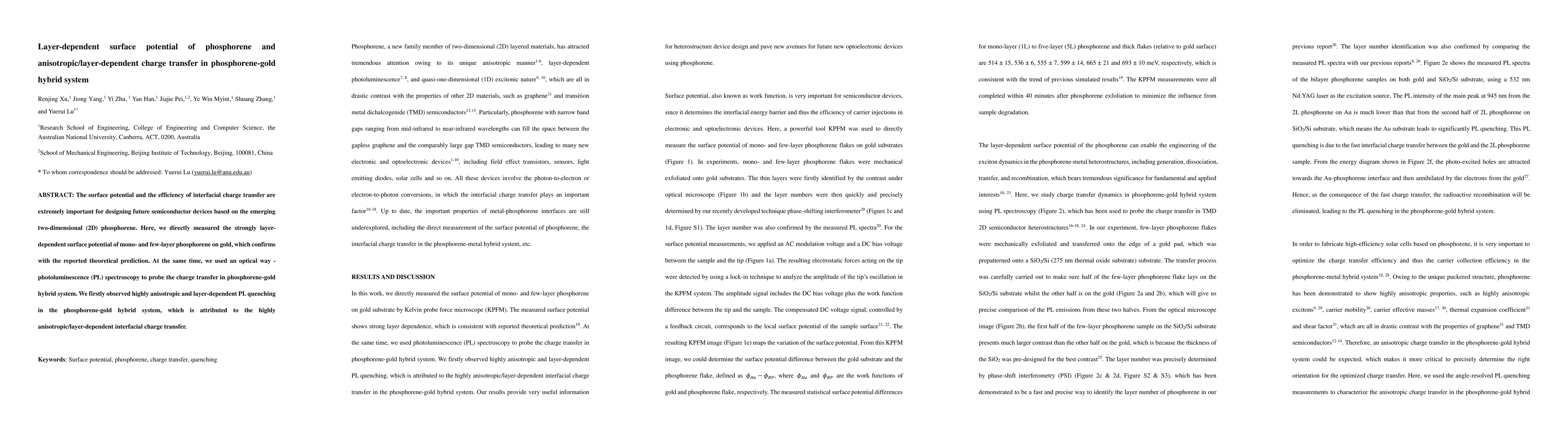 This study measures the layer-dependent surface potential of phosphorene on gold, confirming theoretical predictions, and uses photoluminescence spectroscopy to observe highly anisotropic and layer-dependent charge transfer in phosphorene-gold hybrids.