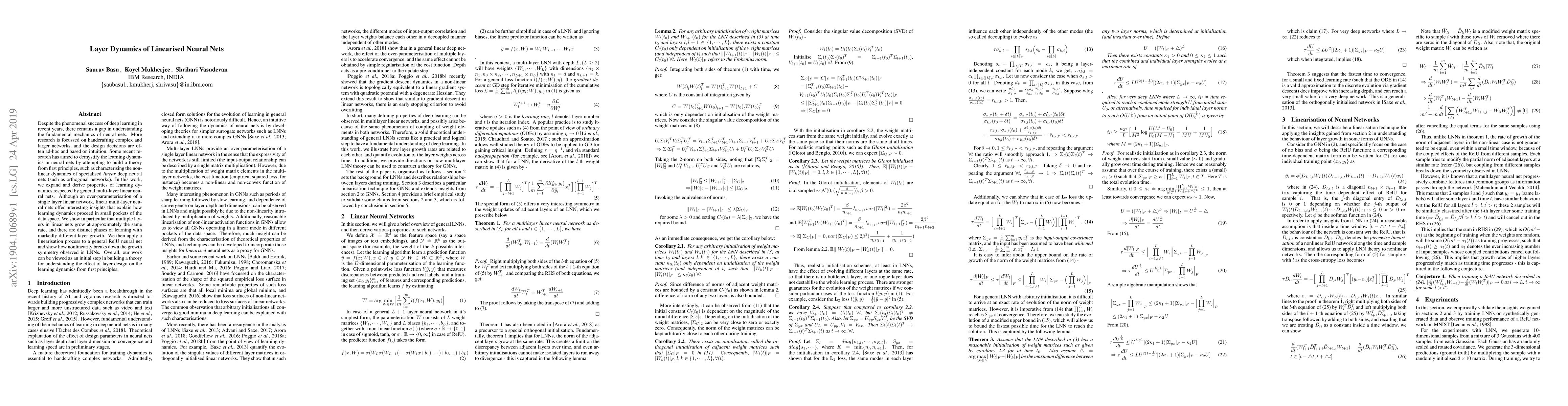 This paper explores the learning dynamics of multi-layer linear neural networks, revealing that layers grow at similar rates and identifying distinct learning phases. It also applies linearisation to ReLU networks to demonstrate how nonlinearity disrupts the symmetry observed in linear networks, aiming to build a foundational theory for understanding layer design effects on learning dynamics.