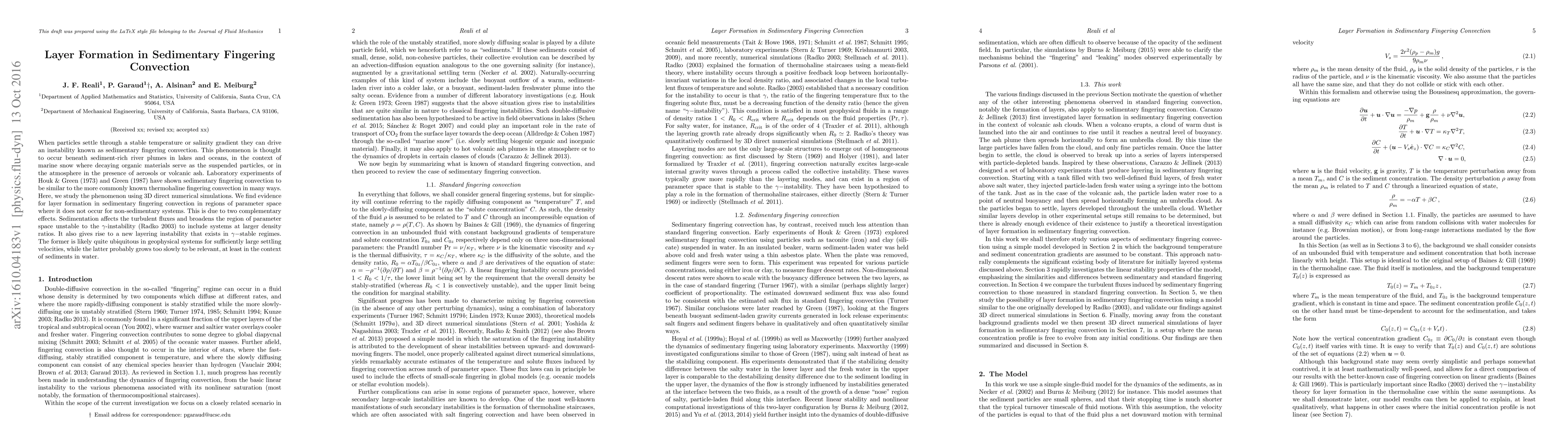 When particles settle through a stable temperature or salinity gradient they can drive an instability known as sedimentary fingering convection. This phenomenon is thought to occur beneath sediment-rich river plumes in lakes and oceans, in the context of marine snow where decaying organic materials serve as the suspended particles, or in the atmosphere in the presence of aerosols or volcanic ash. Laboratory experiments of Houk and Green (1973) and Green (1987) have shown sedimentary fingering convection to be similar to the more commonly known thermohaline fingering convection in many ways. Here, we study the phenomenon using 3D direct numerical simulations. We find evidence for layer formation in sedimentary fingering convection in regions of parameter space where it does not occur for non-sedimentary systems. This is due to two complementary effects. Sedimentation affects the turbulent fluxes and broadens the region of parameter space unstable to the $\gamma$-instability (Radko 2003) to include systems at larger density ratios. It also gives rise to a new layering instability that exists in $\gamma-$stable regimes. The former is likely quite ubiquitous in geophysical systems for sufficiently large settling velocities, while the latter probably grows too slowly to be relevant, at least in the context of sediments in water.