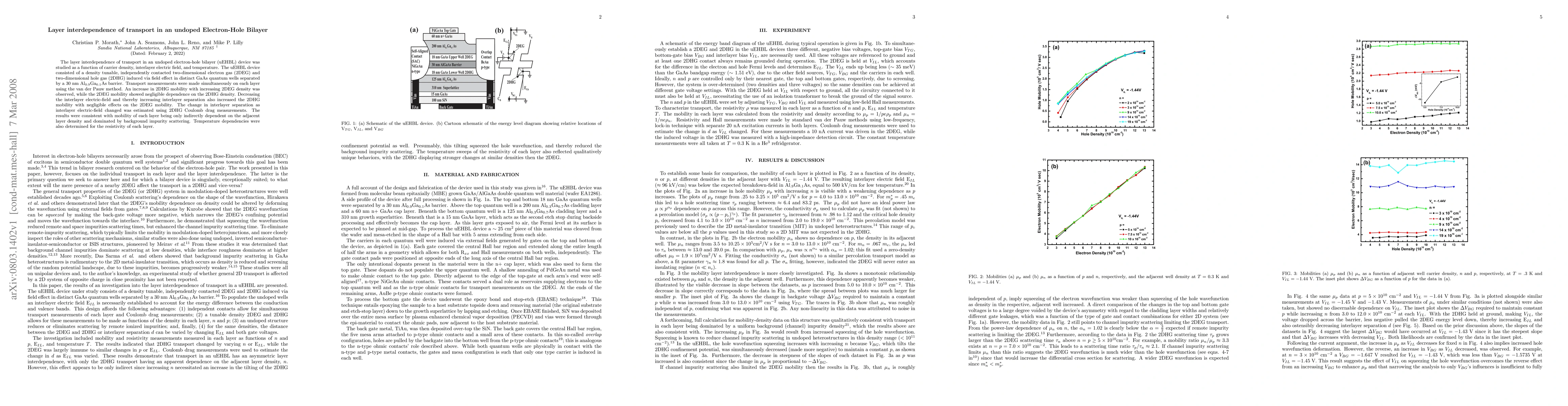 The layer interdependence of transport in an undoped electron-hole bilayer (uEHBL) device was studied as a function of carrier density, interlayer electric field, and temperature. The uEHBL device consisted of a density tunable, independently contacted two-dimensional electron gas (2DEG) and two-dimensional hole gas (2DHG) induced via field effect in distinct GaAs quantum wells separated by a 30 nm Al$_{0.9}$Ga$_{0.1}$As barrier. Transport measurements were made simultaneously on each layer using the van der Pauw method. An increase in 2DHG mobility with increasing 2DEG density was observed, while the 2DEG mobility showed negligible dependence on the 2DHG density. Decreasing the interlayer electric-field and thereby increasing interlayer separation also increased the 2DHG mobility with negligible effects on the 2DEG mobility. The change in interlayer separation as interlayer electric-field changed was estimated using 2DHG Coulomb drag measurements. The results were consistent with mobility of each layer being only indirectly dependent on the adjacent layer density and dominated by background impurity scattering. Temperature dependencies were also determined for the resistivity of each layer.