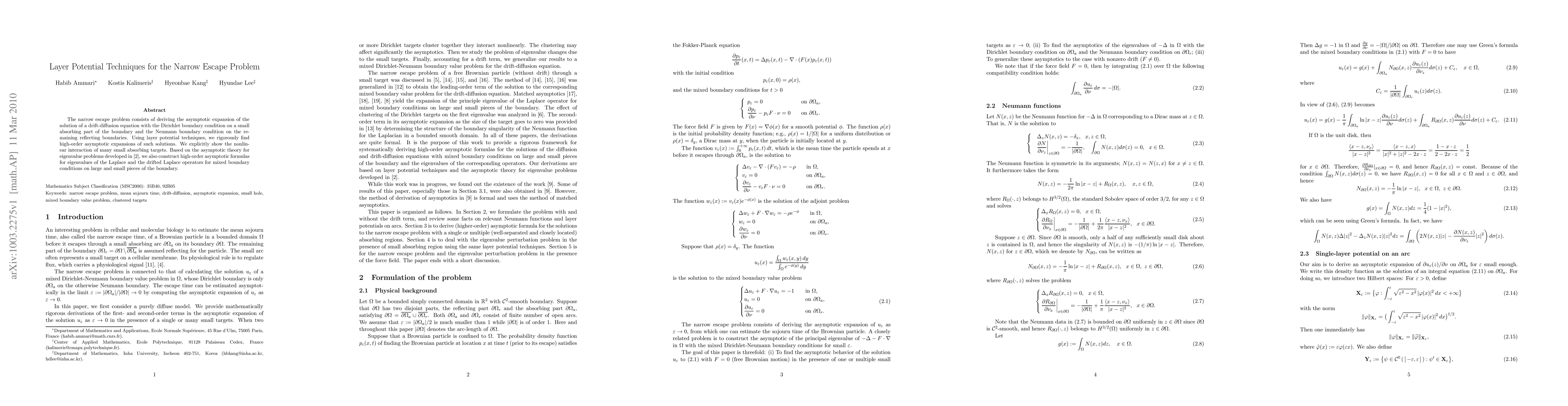 The narrow escape problem consists of deriving the asymptotic expansion of the solution of a drift-diffusion equation with the Dirichlet boundary condition on a small absorbing part of the boundary and the Neumann boundary condition on the remaining reflecting boundaries. Using layer potential techniques, we rigorously find high-order asymptotic expansions of such solutions. We explicitly show the nonlinear interaction of many small absorbing targets. Based on the asymptotic theory for eigenvalue problems developed in \cite{book}, we also construct high-order asymptotic formulas for eigenvalues of the Laplace and the drifted Laplace operators for mixed boundary conditions on large and small pieces of the boundary.