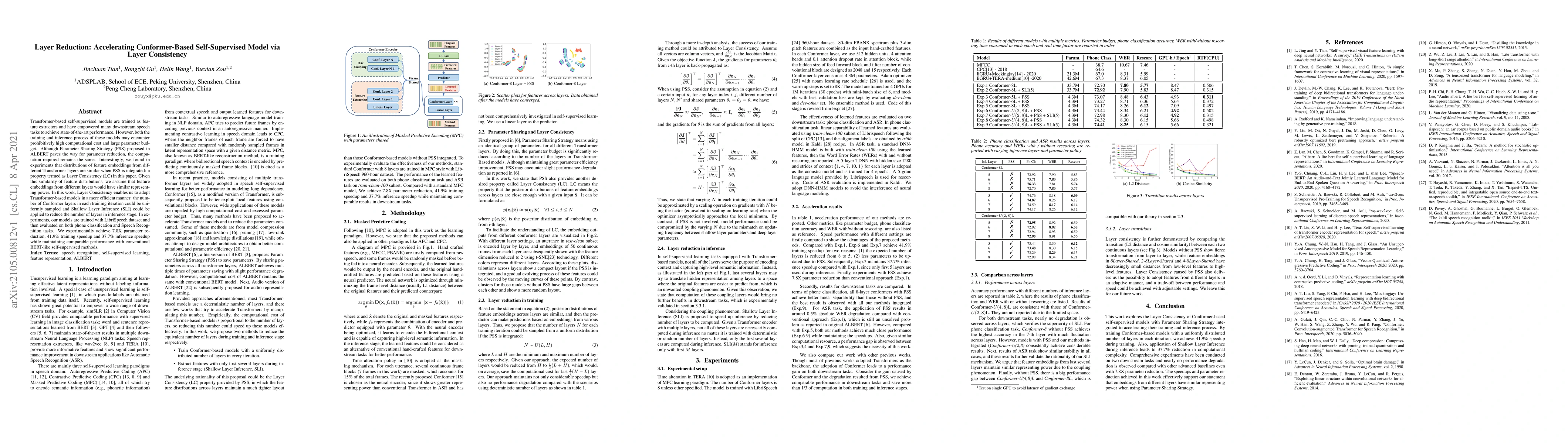 Transformer-based self-supervised models are trained as feature extractors and have empowered many downstream speech tasks to achieve state-of-the-art performance. However, both the training and inference process of these models may encounter prohibitively high computational cost and large parameter budget. Although Parameter Sharing Strategy (PSS) proposed in ALBERT paves the way for parameter reduction, the computation required remains the same. Interestingly, we found in experiments that distributions of feature embeddings from different Transformer layers are similar when PSS is integrated: a property termed as Layer Consistency (LC) in this paper. Given this similarity of feature distributions, we assume that feature embeddings from different layers would have similar representing power. In this work, Layer Consistency enables us to adopt Transformer-based models in a more efficient manner: the number of Conformer layers in each training iteration could be uniformly sampled and Shallow Layer Inference (SLI) could be applied to reduce the number of layers in inference stage. In experiments, our models are trained with LibriSpeech dataset and then evaluated on both phone classification and Speech Recognition tasks. We experimentally achieve 7.8X parameter reduction, 41.9% training speedup and 37.7% inference speedup while maintaining comparable performance with conventional BERT-like self-supervised methods.