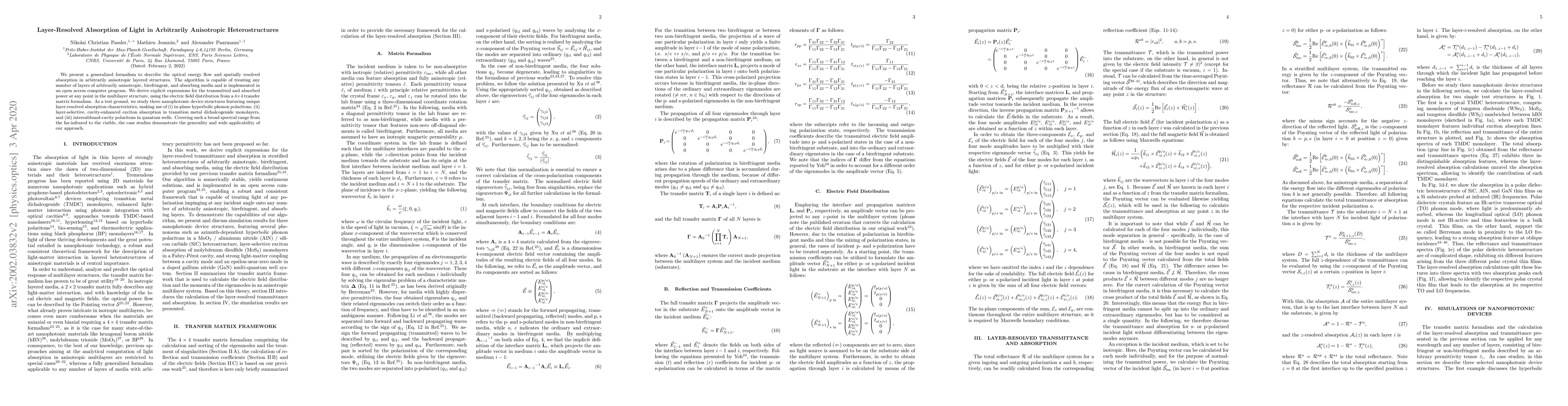 We present a generalized formalism to describe the optical energy flow and spatially resolved absorption in arbitrarily anisotropic layered structures. The algorithm is capable of treating any number of layers of arbitrarily anisotropic, birefringent, and absorbing media and is implemented in an open access computer program. We derive explicit expressions for the transmitted and absorbed power at any point in the multilayer structure, using the electric field distribution from a 4 $\times$ 4 transfer matrix formalism. As a test ground, we study three nanophotonic device structures featuring unique layer-resolved absorption characteristics, making use of (i) in-plane hyperbolic phonon polaritons, (ii) layer-selective, cavity-enhanced exciton absorption in transition metal dichalcogenide monolayers, and (iii) intersubband-cavity polaritons in quantum wells. Covering such a broad spectral range from the far-infrared to the visible, the case studies demonstrate the generality and wide applicability of our approach.