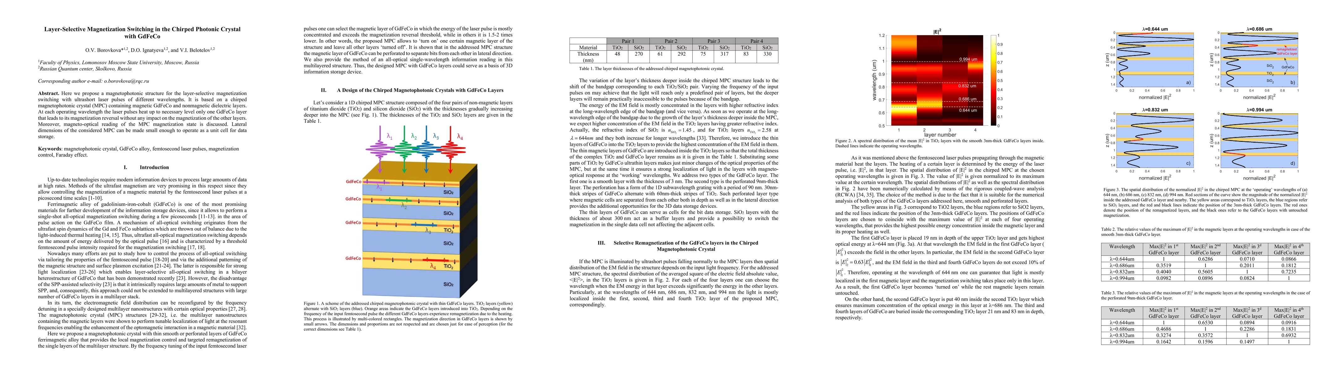 This paper proposes a magnetophotonic structure using a chirped photonic crystal with GdFeCo layers for layer-selective magnetization switching via ultrashort laser pulses. The laser pulses selectively heat and reverse the magnetization of individual GdFeCo layers without affecting others, enabling potential use in data storage.